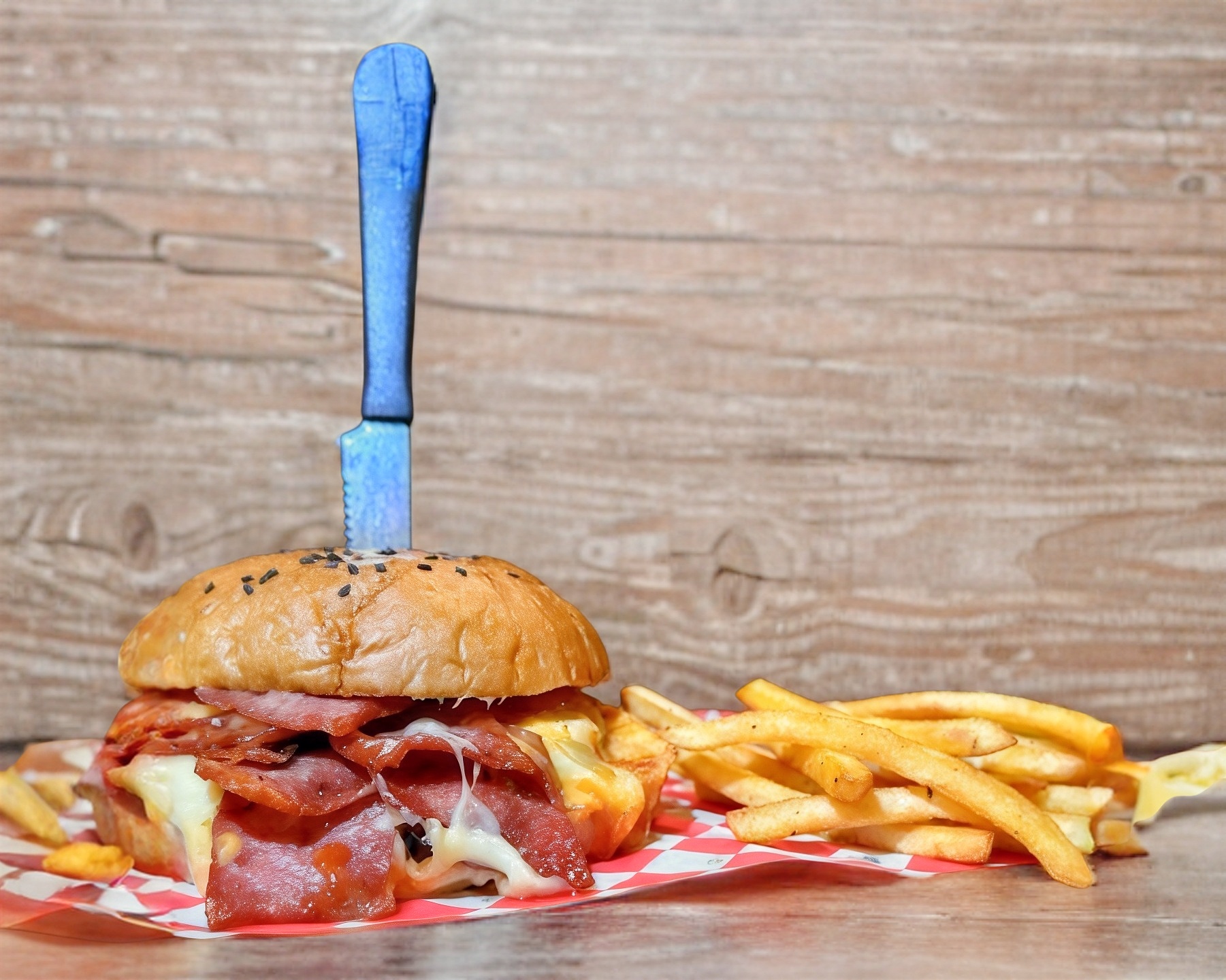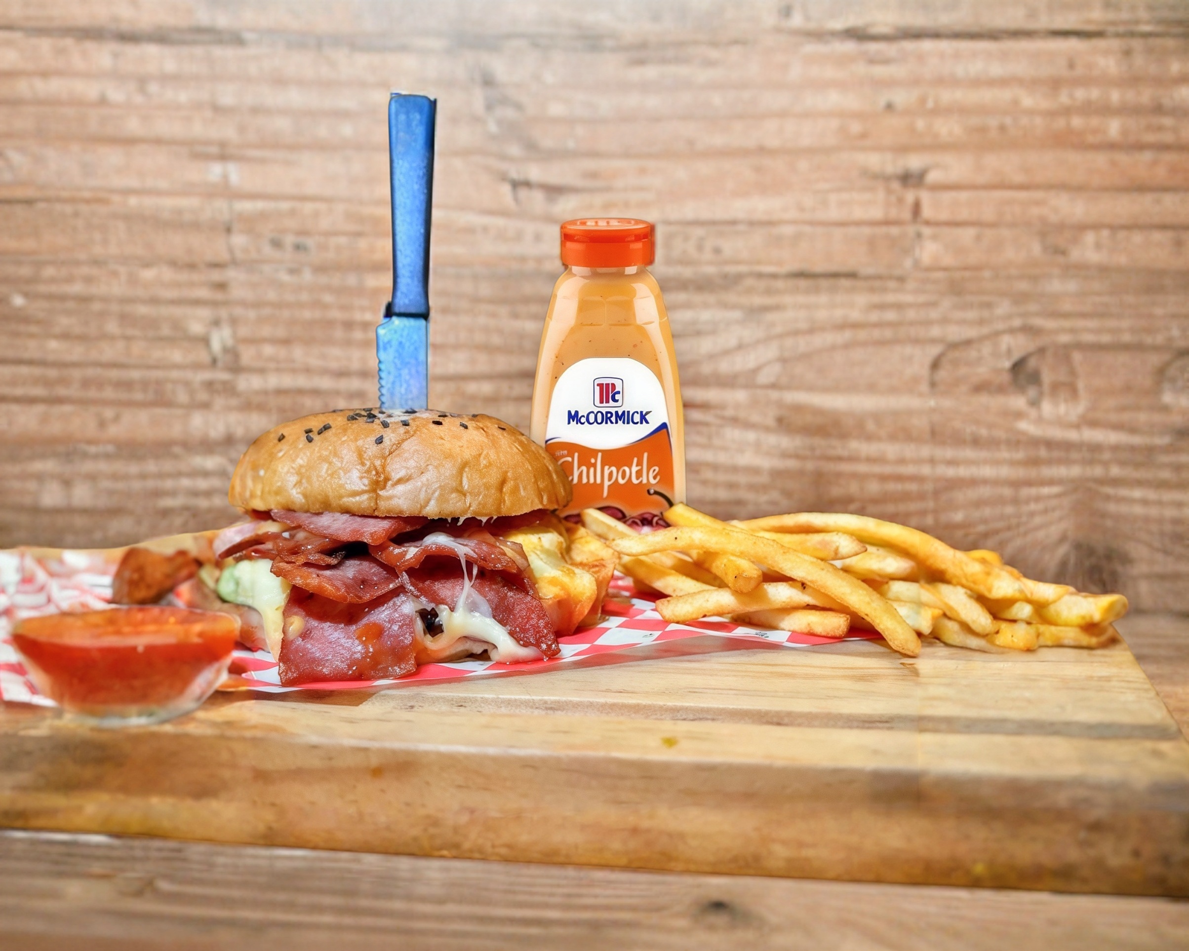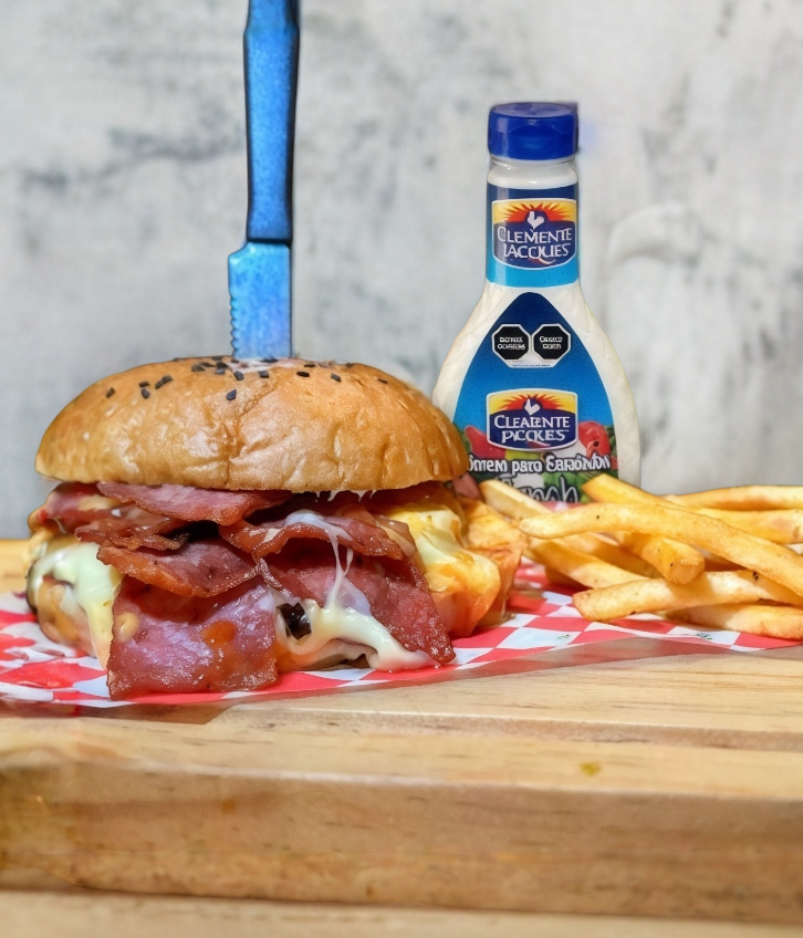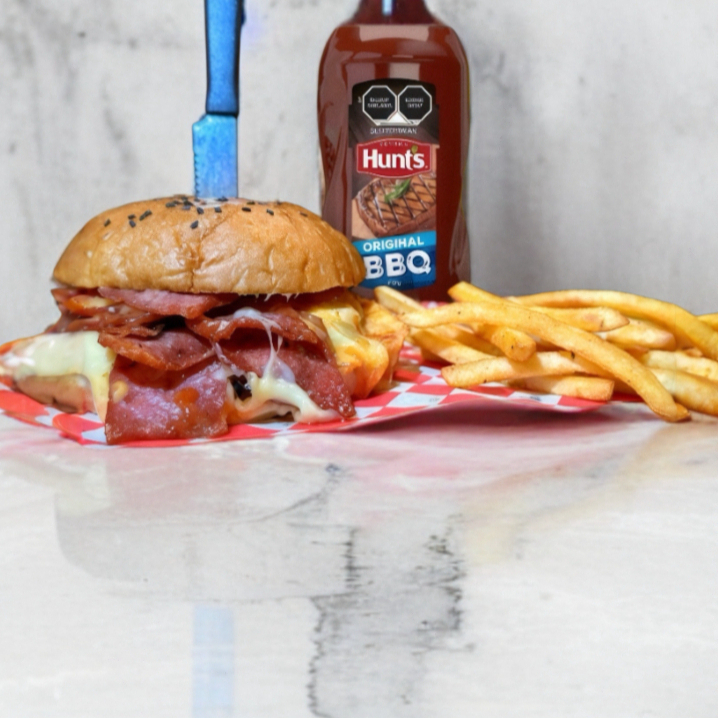 125 gr de carne Sirloin, chorizo, tocino, jamón, aderezo chipotle, cebolla caramelizada y 3 tipos de queso + papas a la francesa.