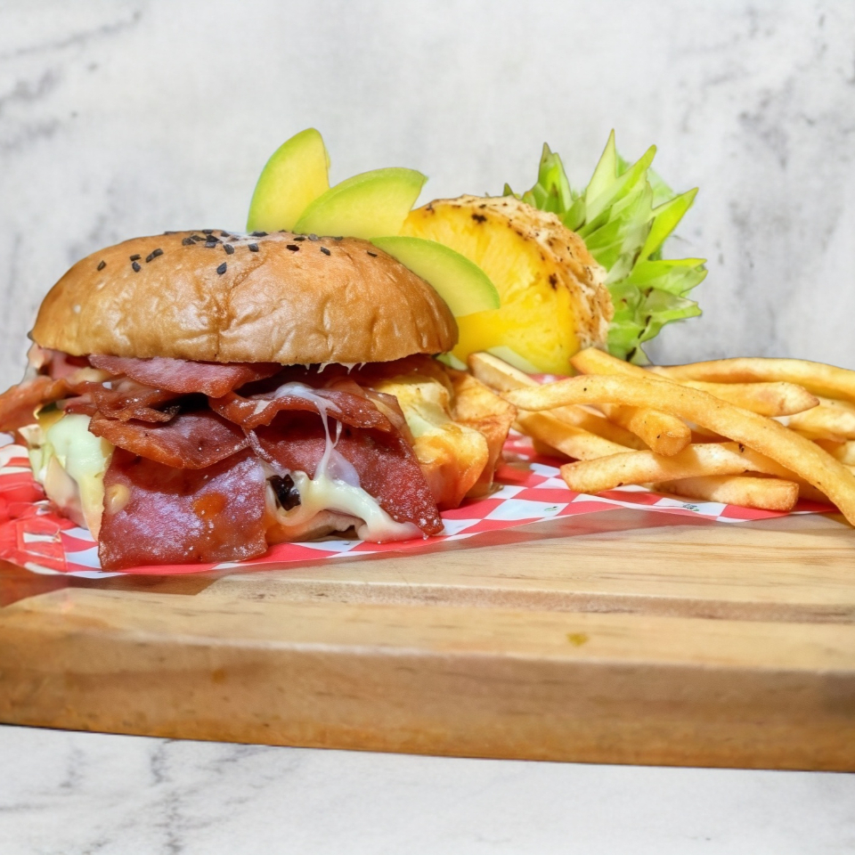 250 gr de carne de sirloin, doble tocino, doble jamón, 3 tipos de queso, con rica piña y aguacate + papas a la francesa.