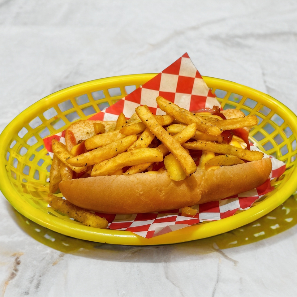 Salchicha de pavo, queso manchego, tocino, cebolla caramelizada, aguacate y queso cheedar.