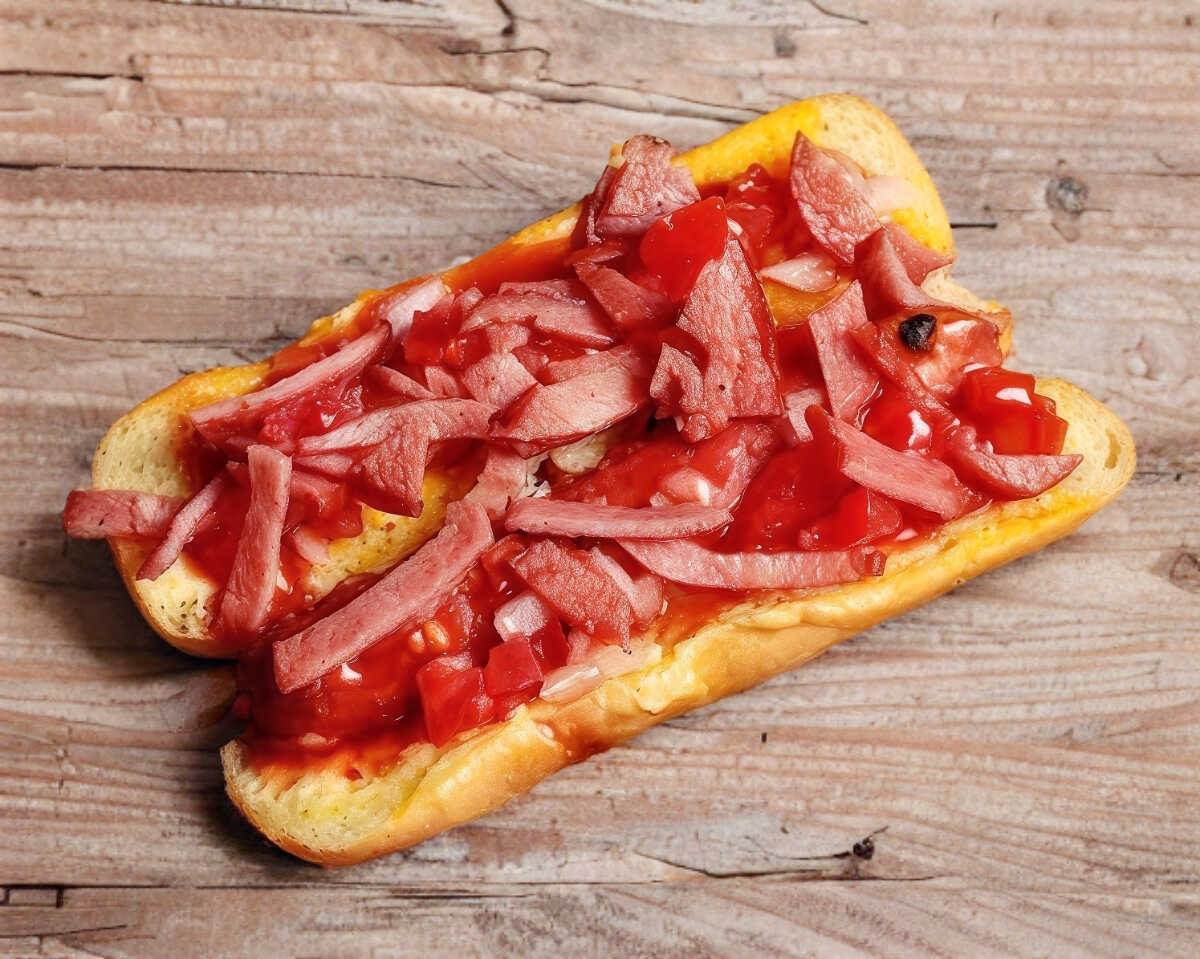 Mayonesa, mostaza, salchicha al carbón, tomate, cebolla, tocino, cátsup.