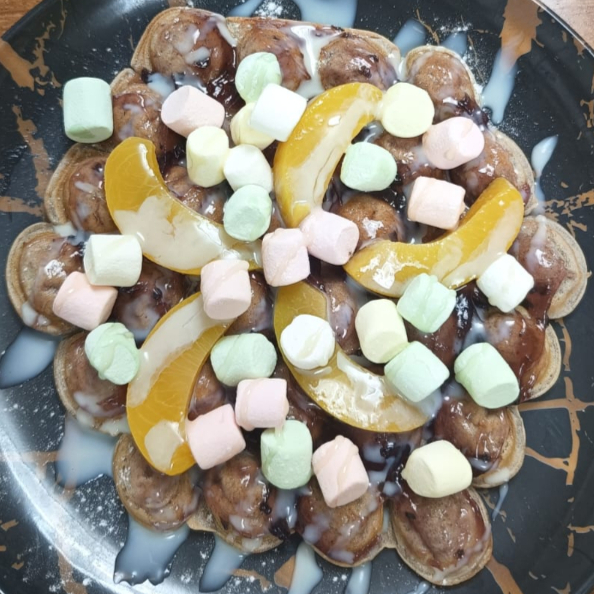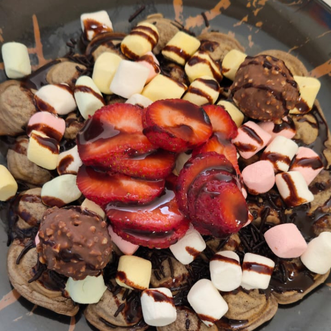 Deliciosa Waffle Futal elaborada con 1 Jalea ó Mermelada con 2 Toppings y 1 Fruta