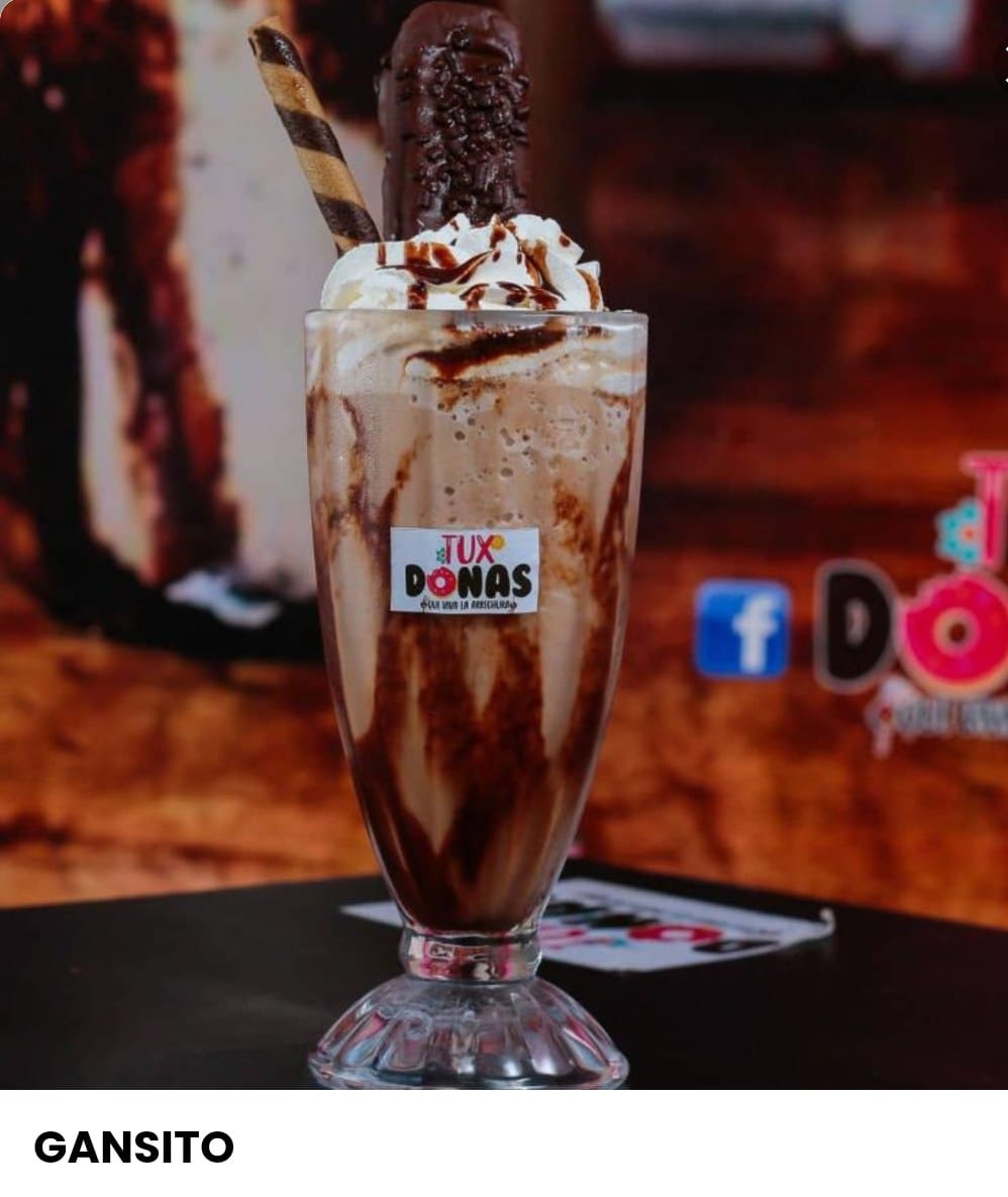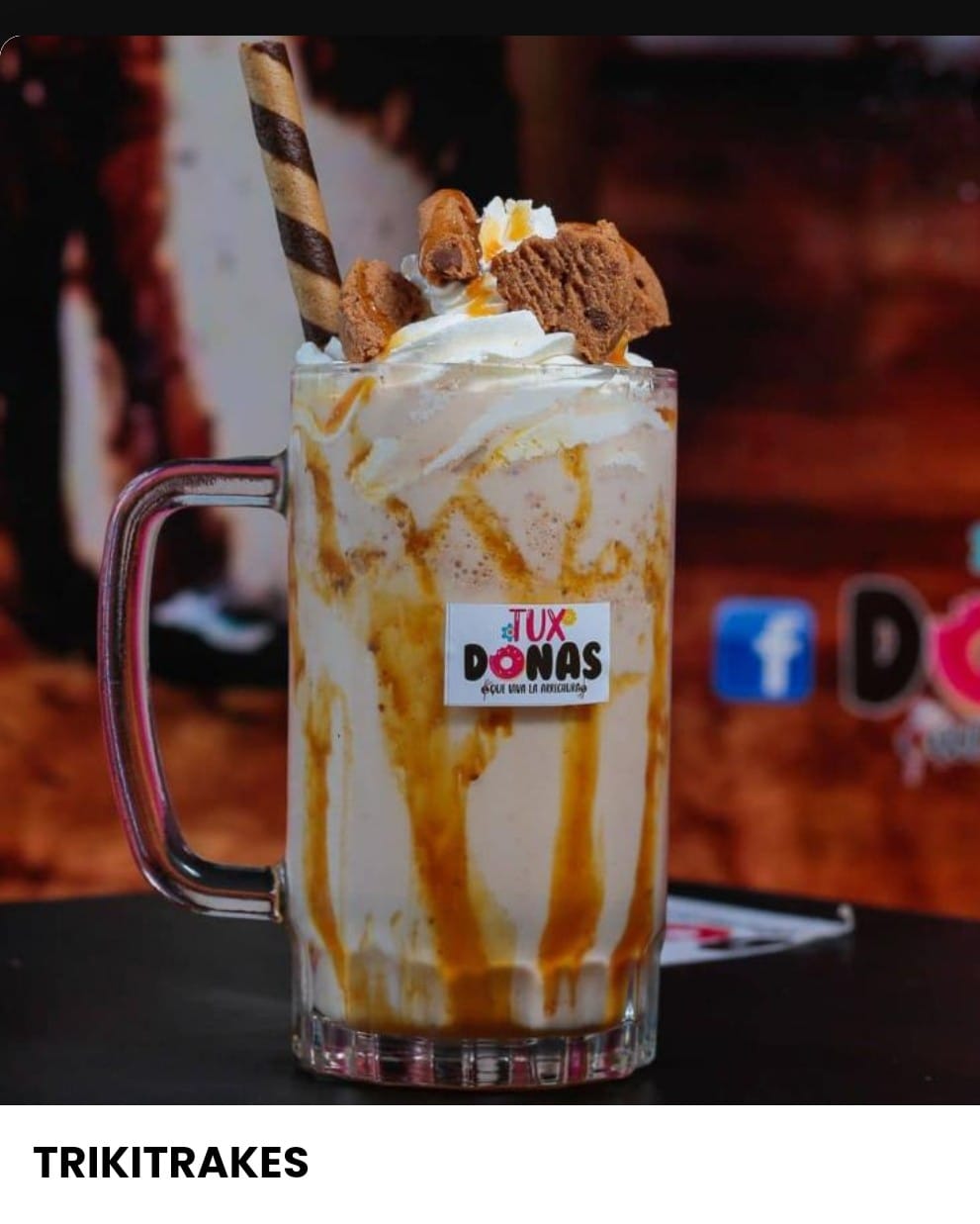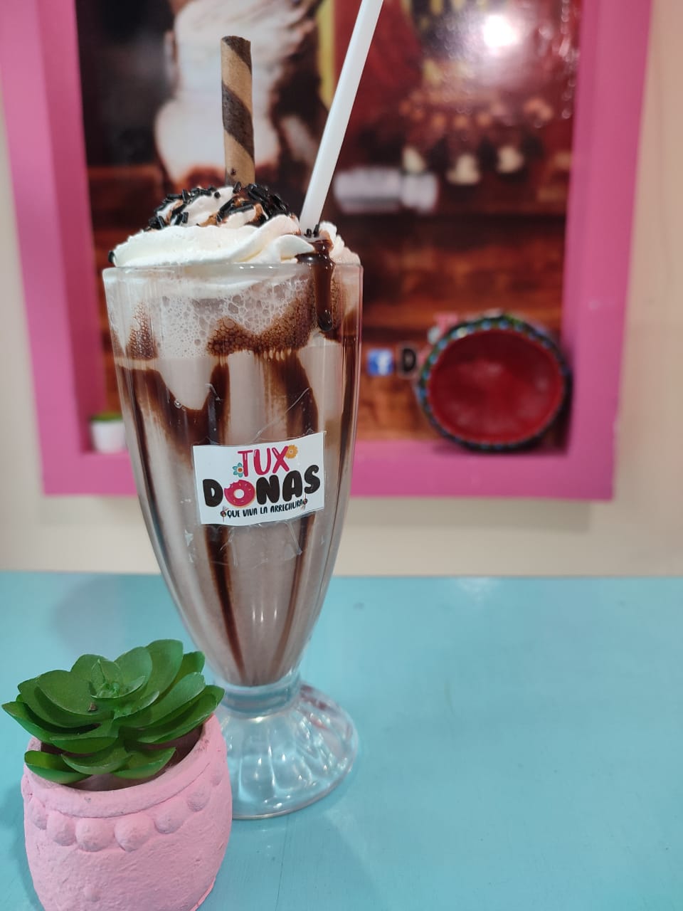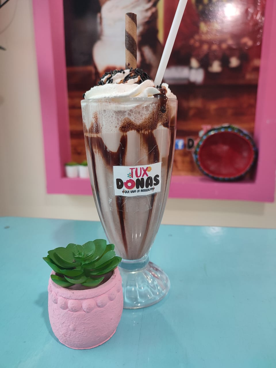 Bebida a base leche, hielo, chocolate, chantilly, hershey's liquido, barquillo y trikitrakes.