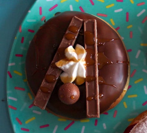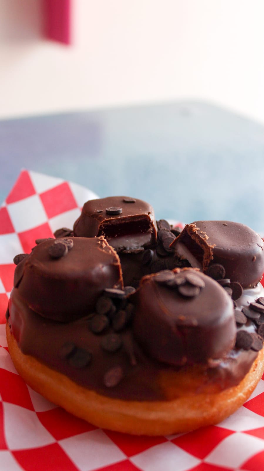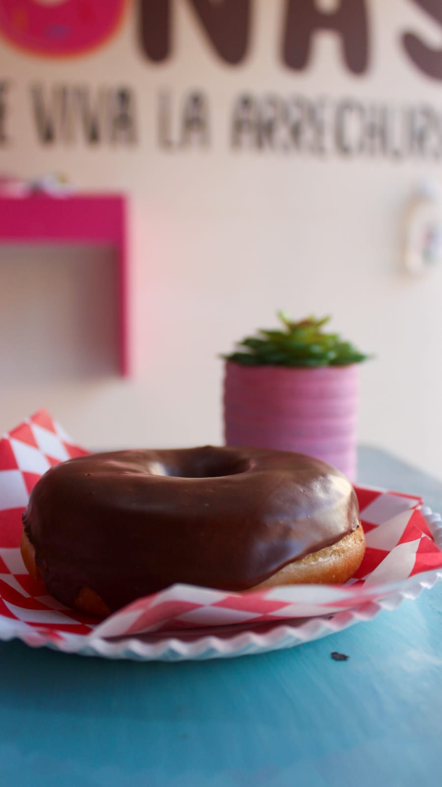 Dona con cobertura de chocolate sabor fresa y chispas de colores