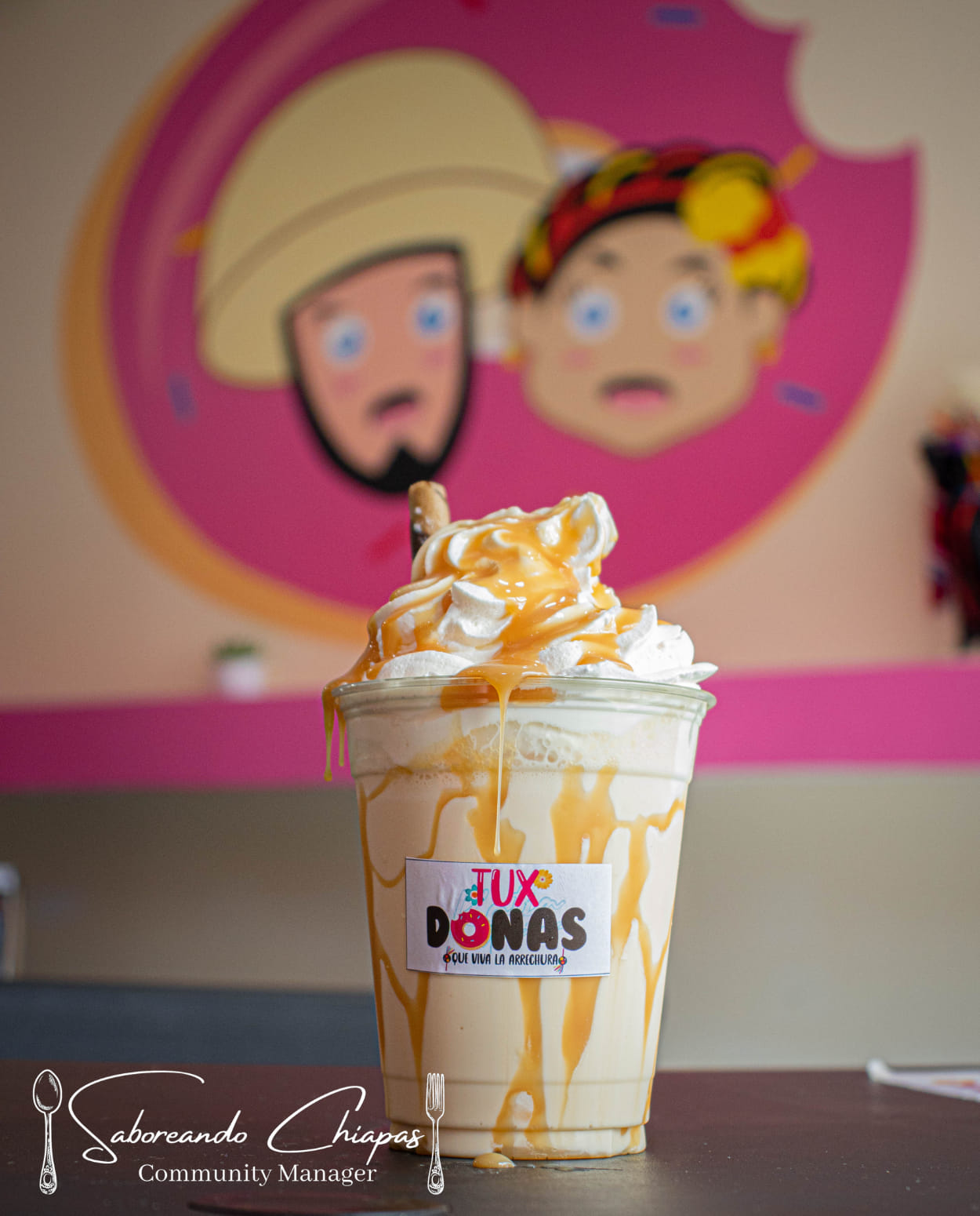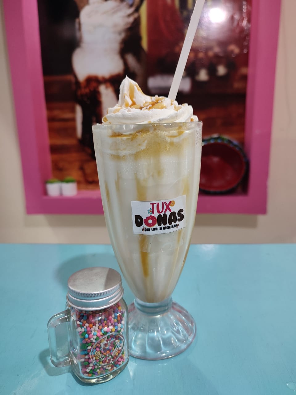 Bebida a base de leche, helado de vainilla, chantilly y cajeta.
