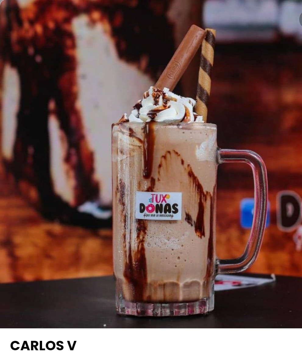 Bebida a base leche, hielo, chocolate, chantilly, hershey's liquido y carlos v.