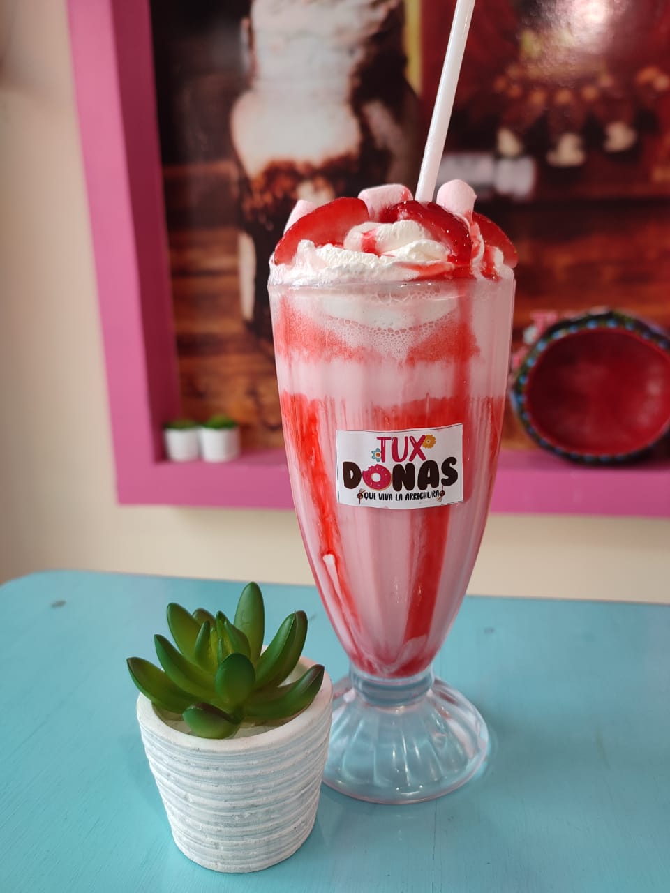 Bebida a base de leche, hielo, chantilly, barquillo, hershey's liquido y fresas naturales.