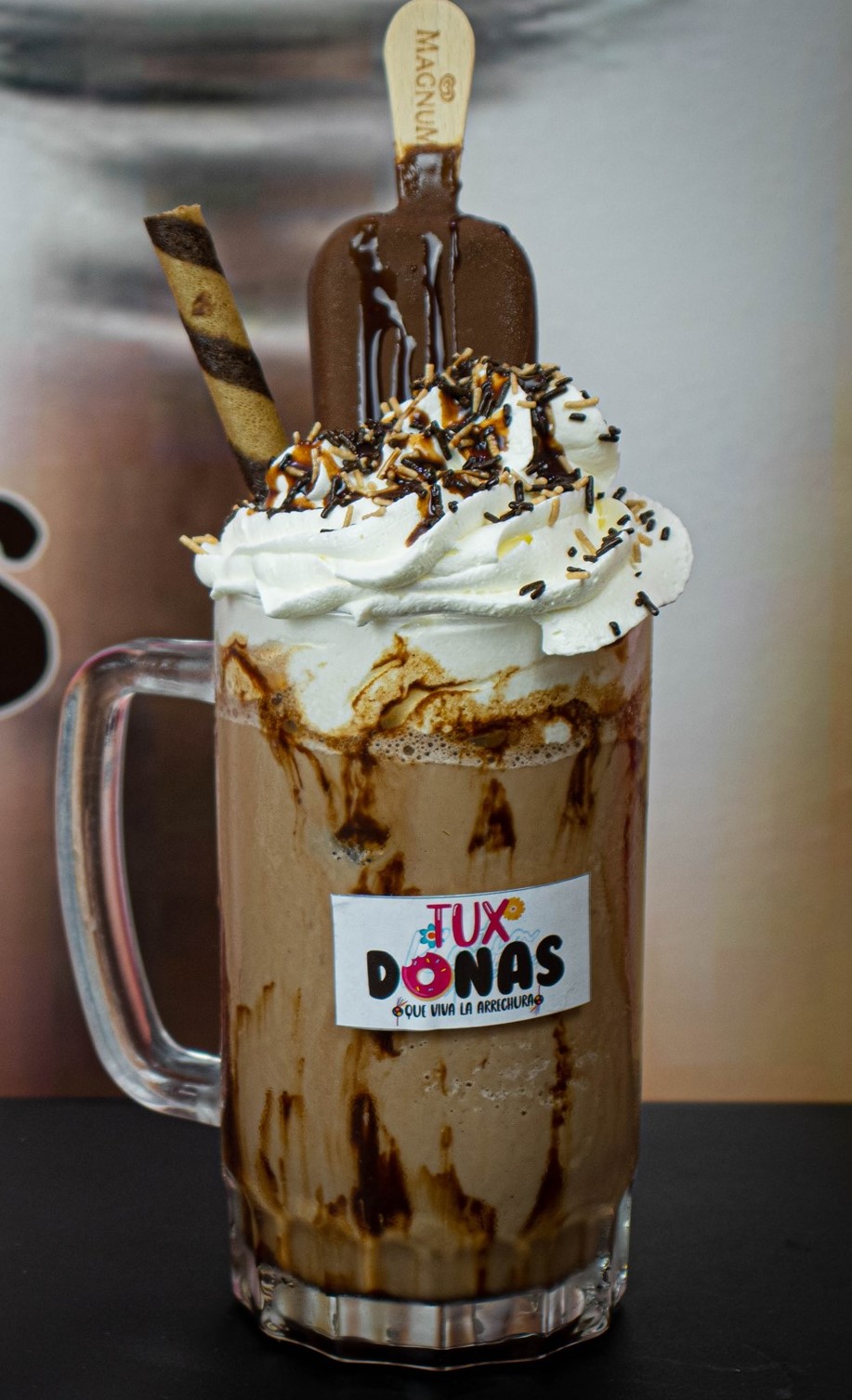 Bebida a base leche, hielo, café, chocolate, chantilly, chispitas, barquillo, hershey's liquido y magnum.