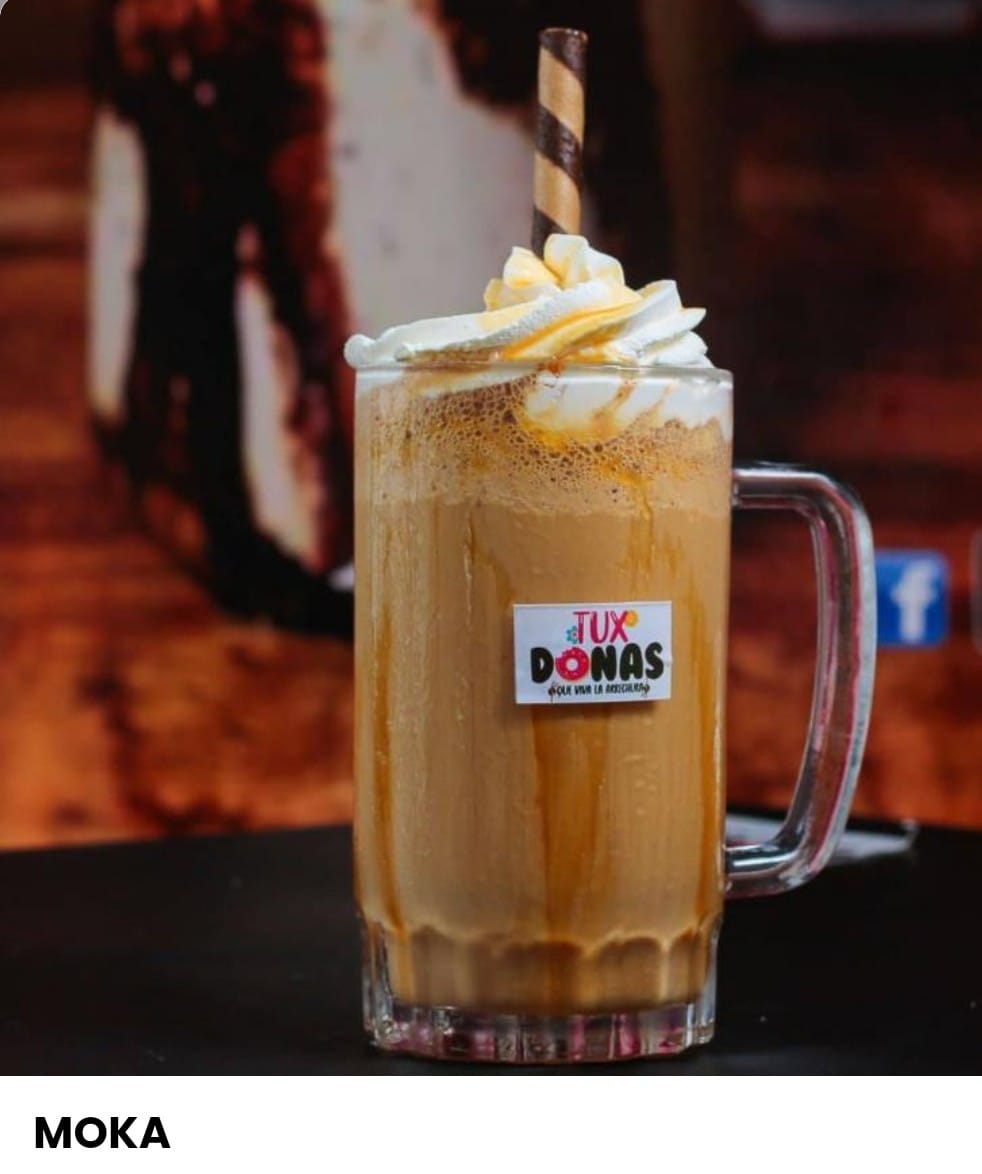 Bebida a base leche, hielo, café, chocolate, chantilly, hershey's liquido de caramelo y barquillo.