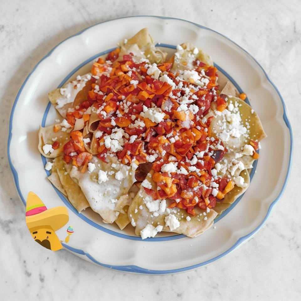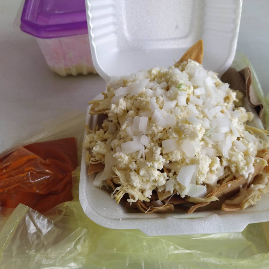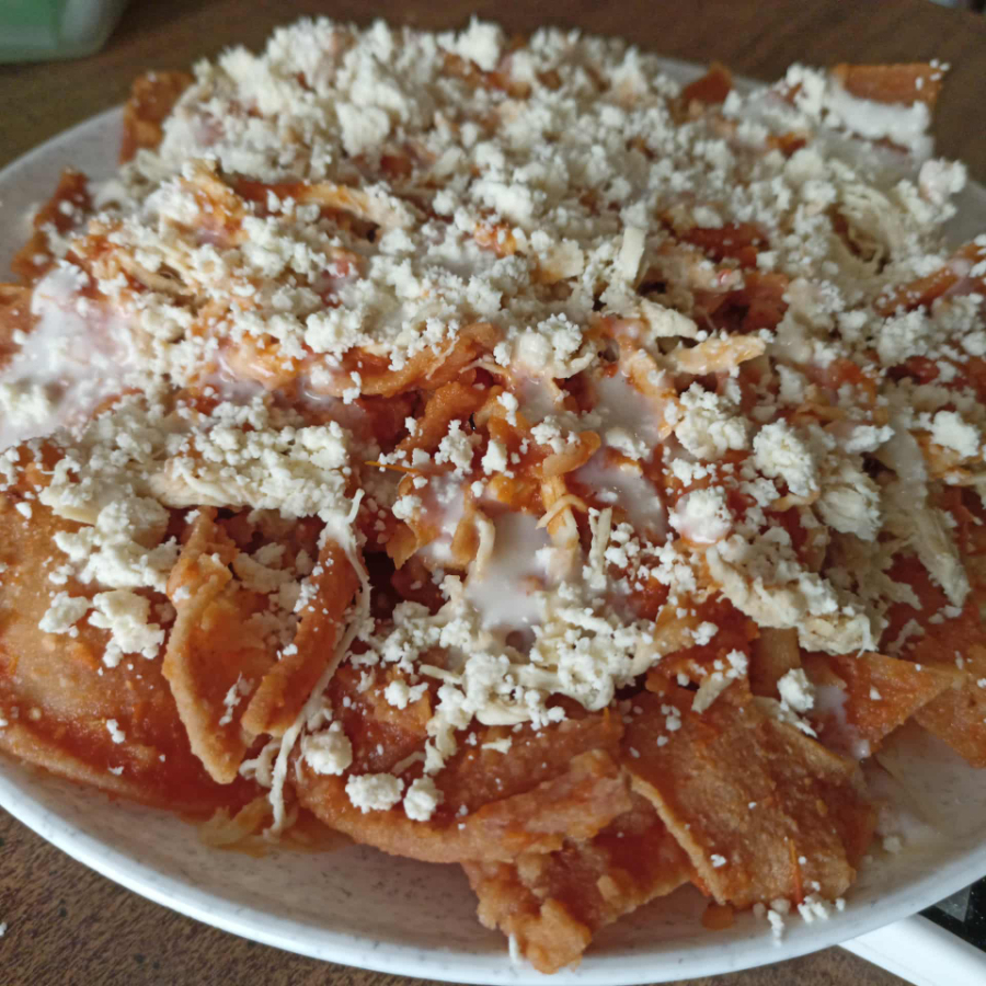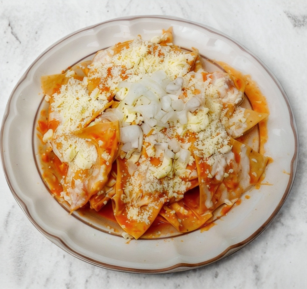 Chilaquiles pequeños (75gr) con pollo deshebrado (30gr), queso, crema, cebolla y la salsa de su preferencia