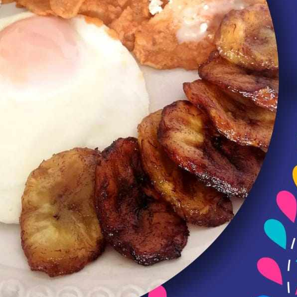 Plátano frito en aceite (aprox. un plátano) con un toque de quesito y una porción de crema.