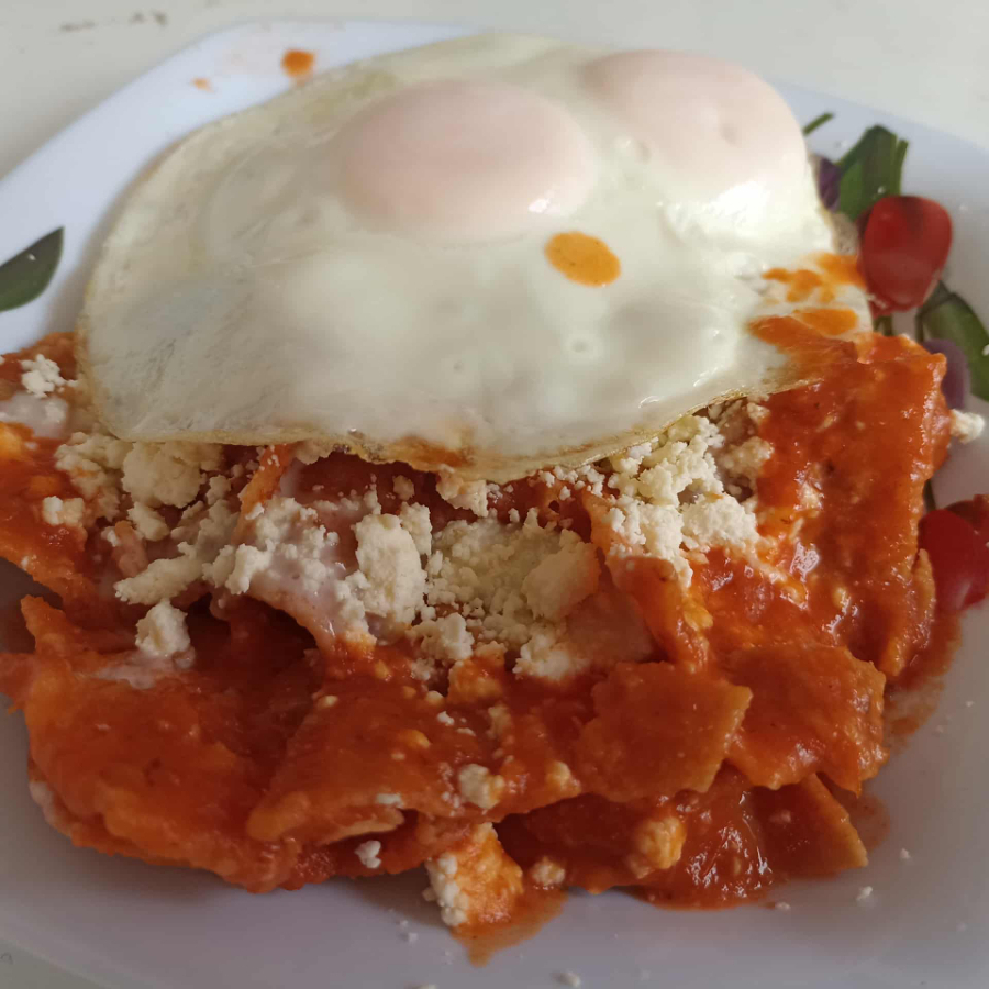 Chilaquiles pequeños (75gr) con un huevo, queso, crema, cebolla y la salsa de su preferencia.
