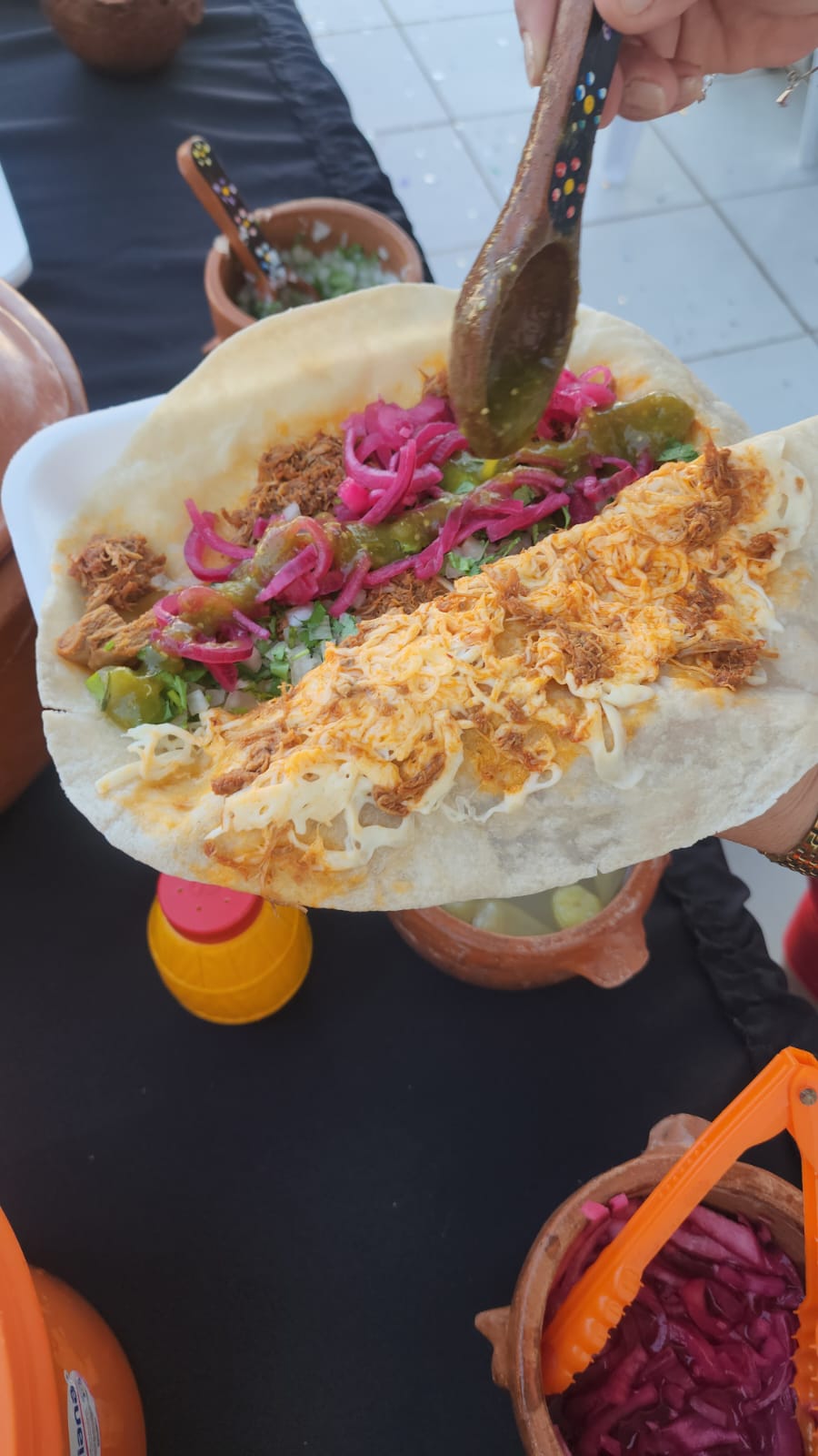 Quesadilla con tortilla echa a mano y carne de cochito.