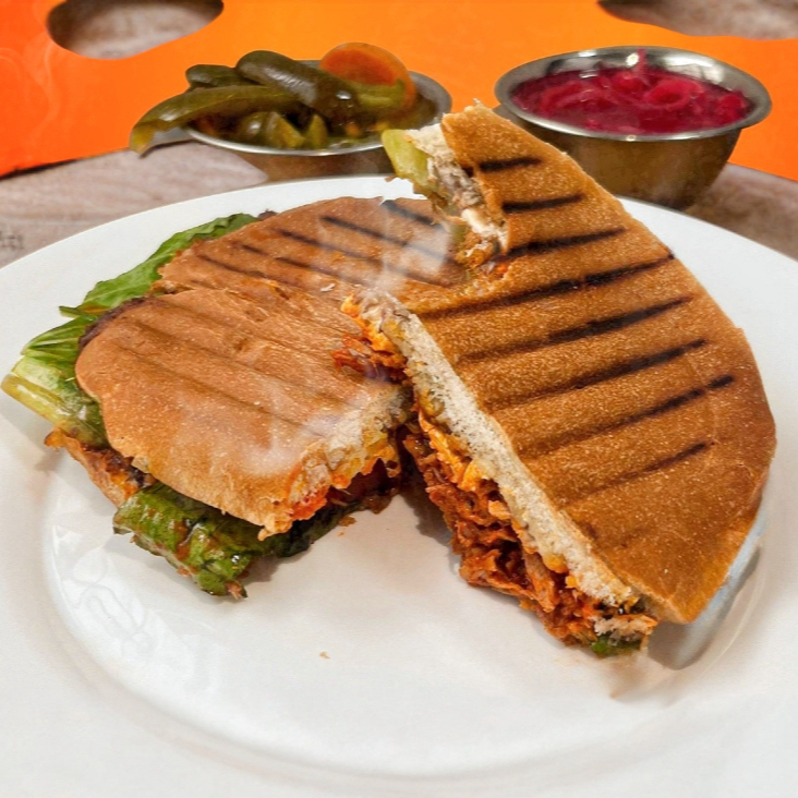 Torta de cochito con frijol, mayonesa, lechuga, tomate, quesillo, acompañado de cebolla morada y chiles en escabeche.
