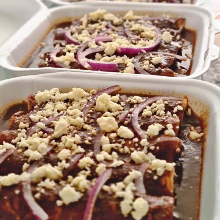 5 tortillas rellenas de pollo, bañadas de mole con queso y crema