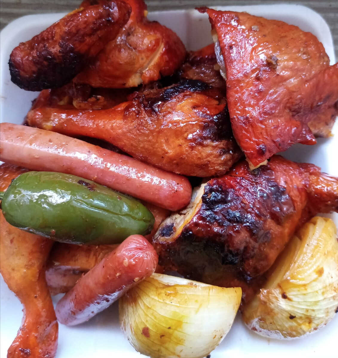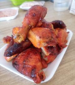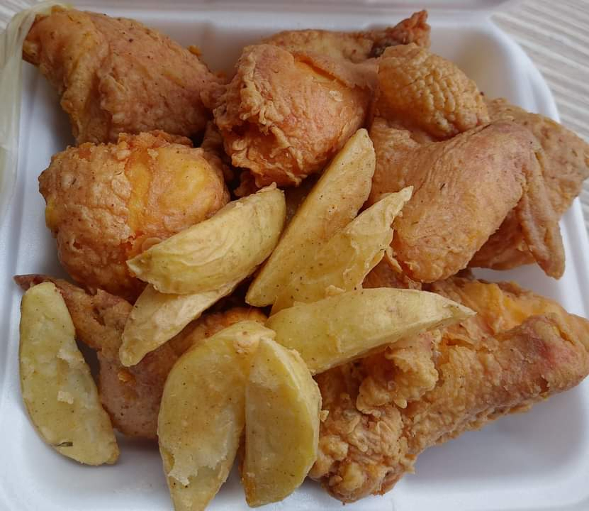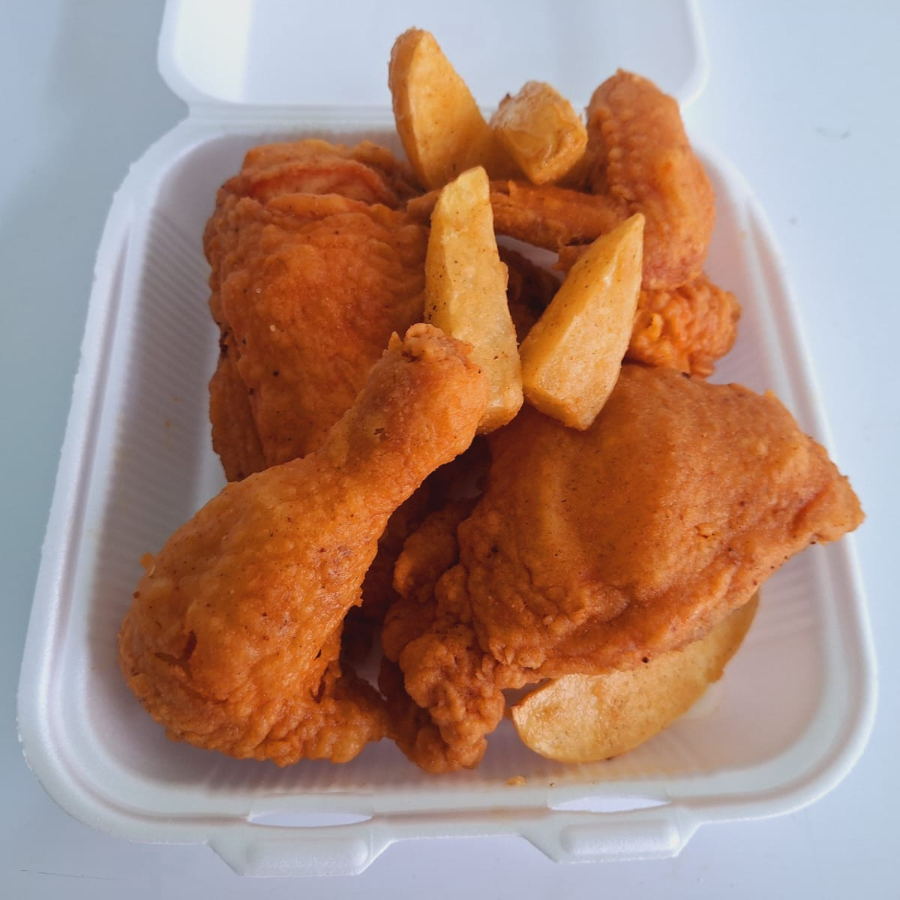 6 pzas De pollo campero, salsa, ensalada, arroz, 5 gajos de papá para degustar.