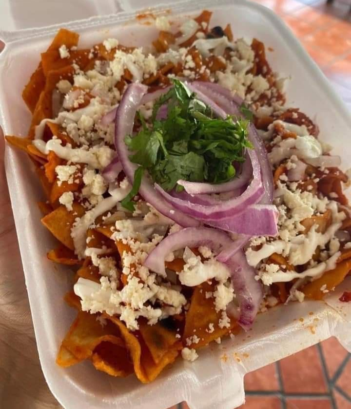 Topos de maíz bañados de salsa, carné de pollo, queso y crema