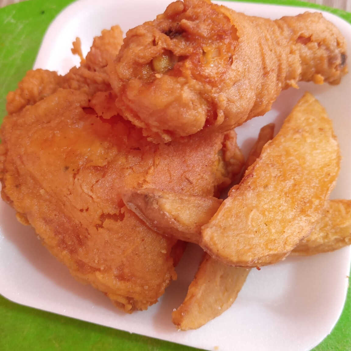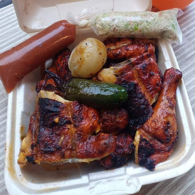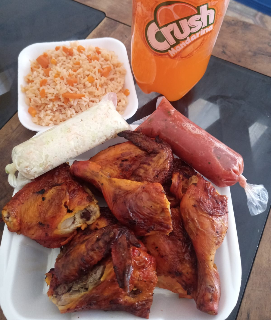 1 Pollo y medio campero, 2 salsas, 2 ensaladas, 2 arroz, papas en gajo (para probar), tortilla, 1 refresco de 2 L.