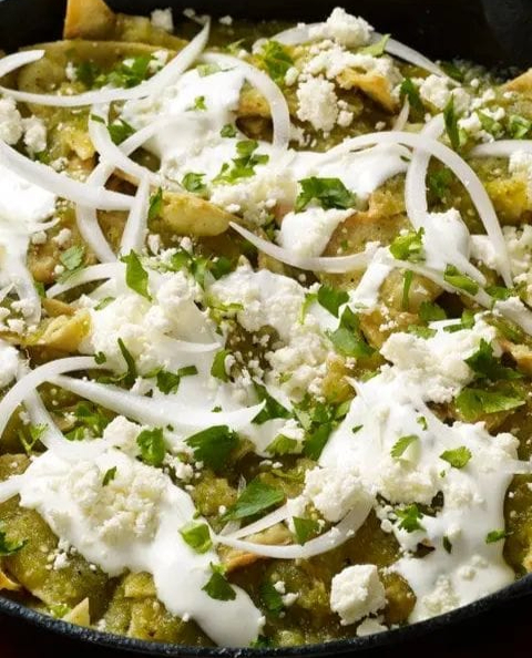 Totopos bañados de salsa con carne de puerco, queso y crema