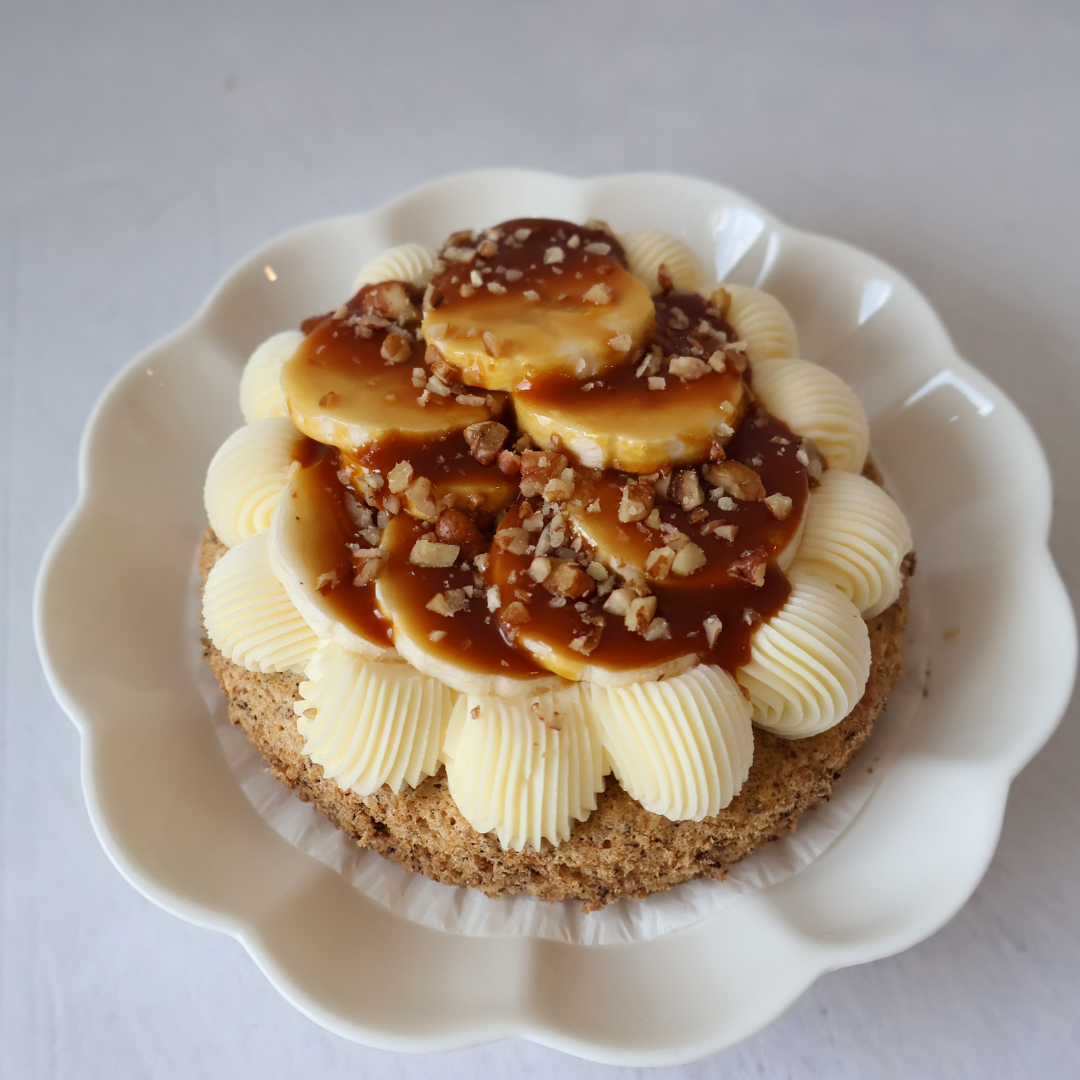 SALUDABLE// Ingredientes: Claras de Huevo, nuez, galletas de almendra troceadas, monk fruit, vainilla, queso crema, plátano y caramelo keto.