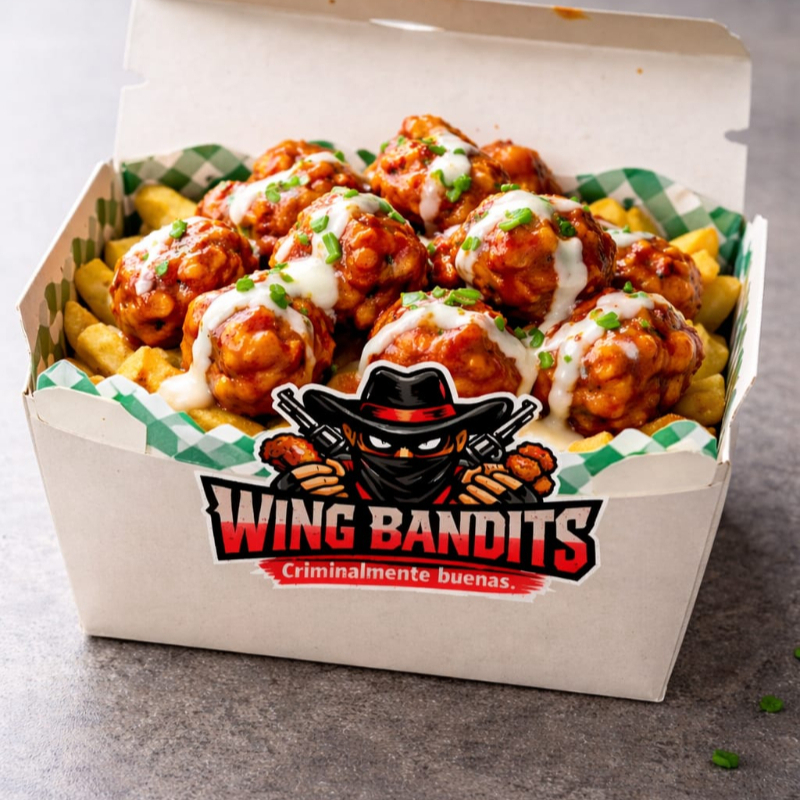 (300g de Papas Corte Grueso + 150g de Tenders En Trocitos o 150g de Boneless + Queso Cheddar Derretido + Tus Aderezos Favoritos)