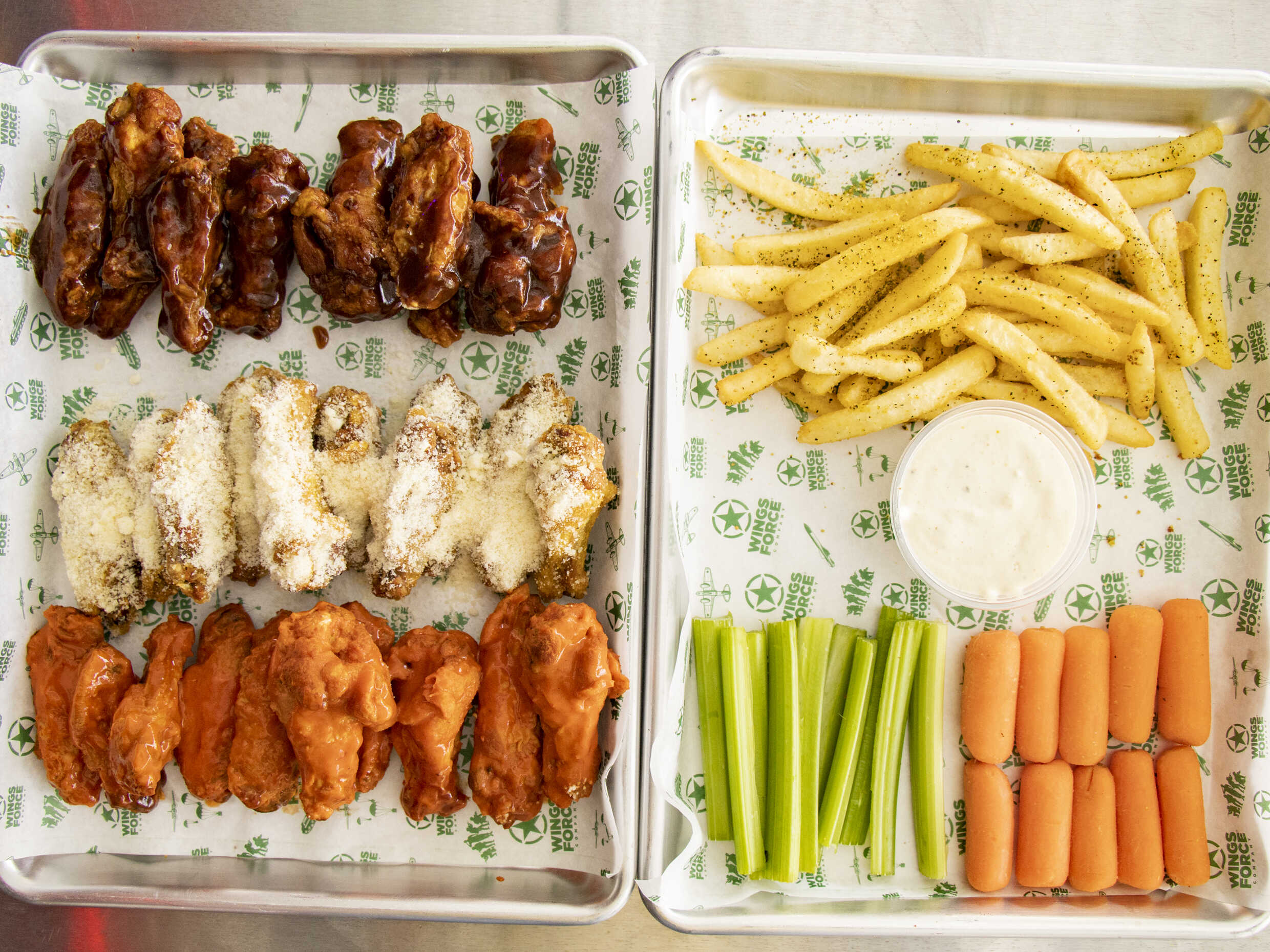 5 alitas diferentes + 5 alitas dulces + 5 alitas picantes+ 5 alitas BBQ+ 220g papas a la francesa + 250g tenders + vegetales + 1 aderezo grande 120ml.