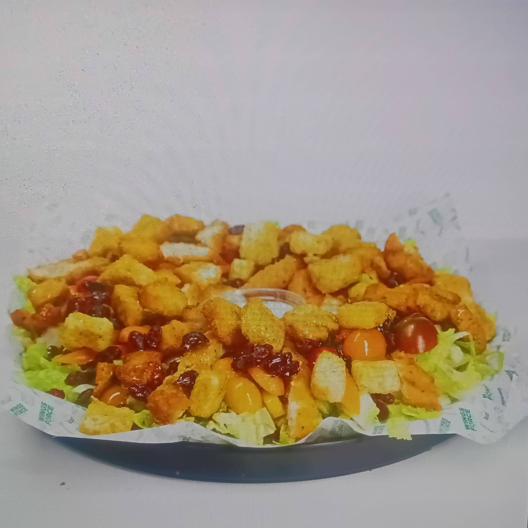 Lechuga, tomate cherry Arándanos, crutones, pollo crispy, zanahoria baby y salsa honey mustard