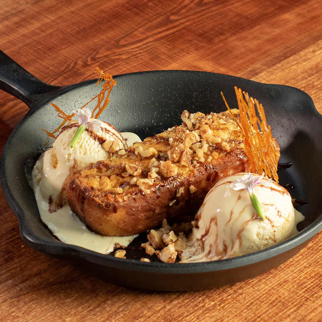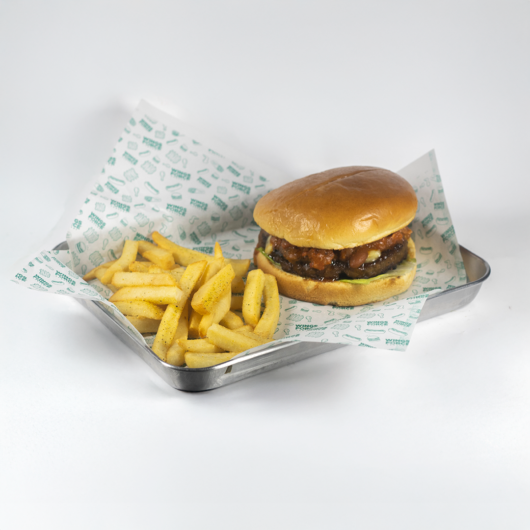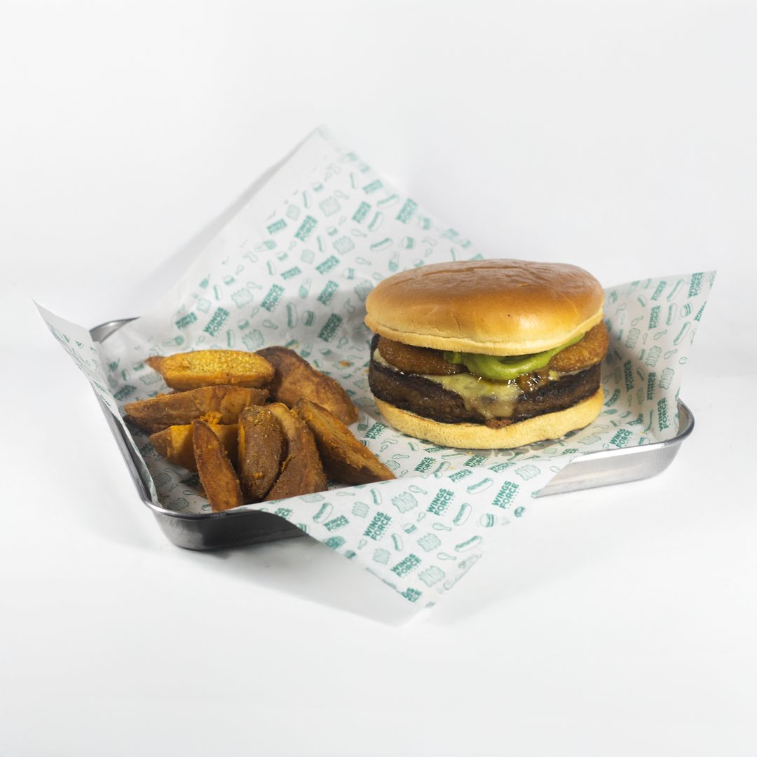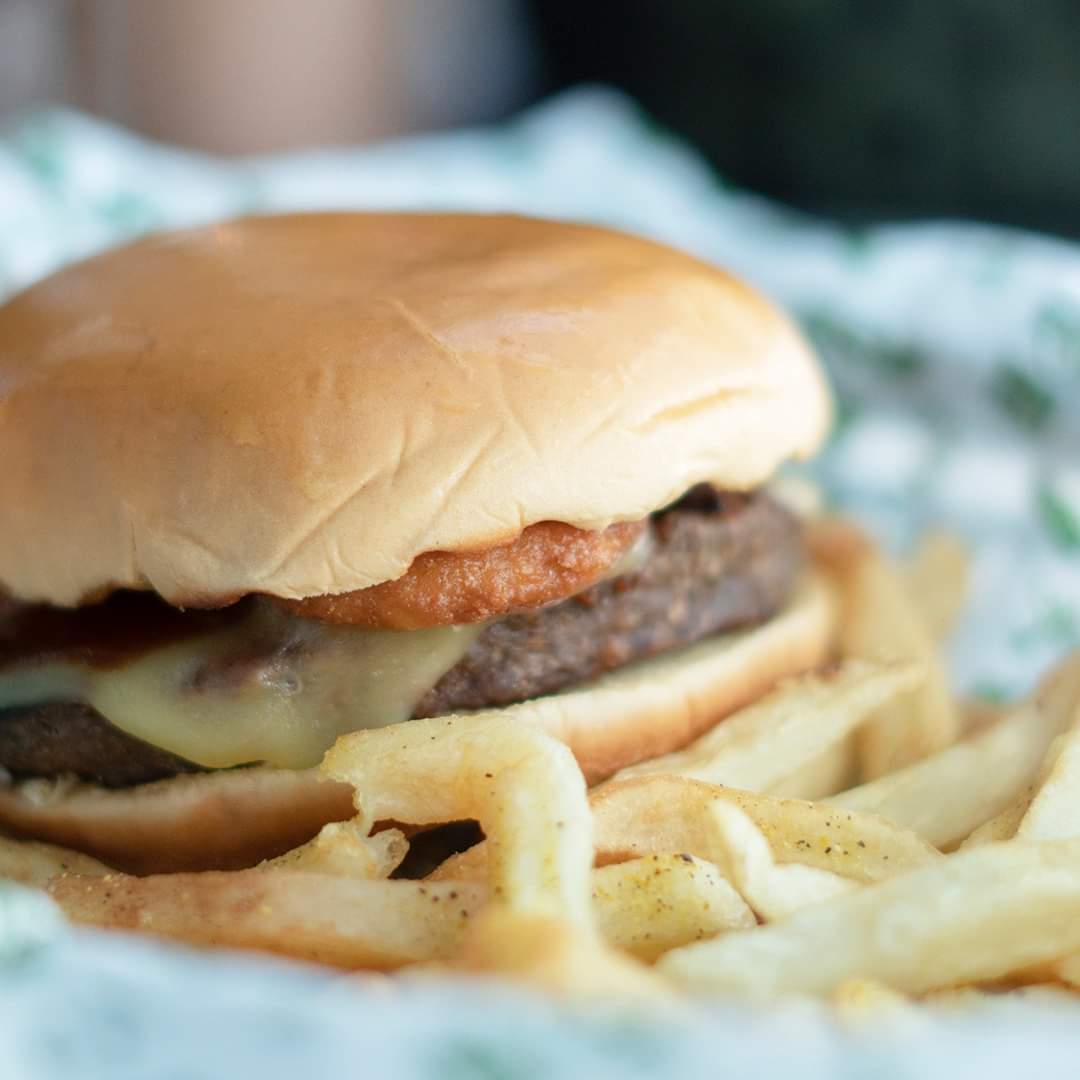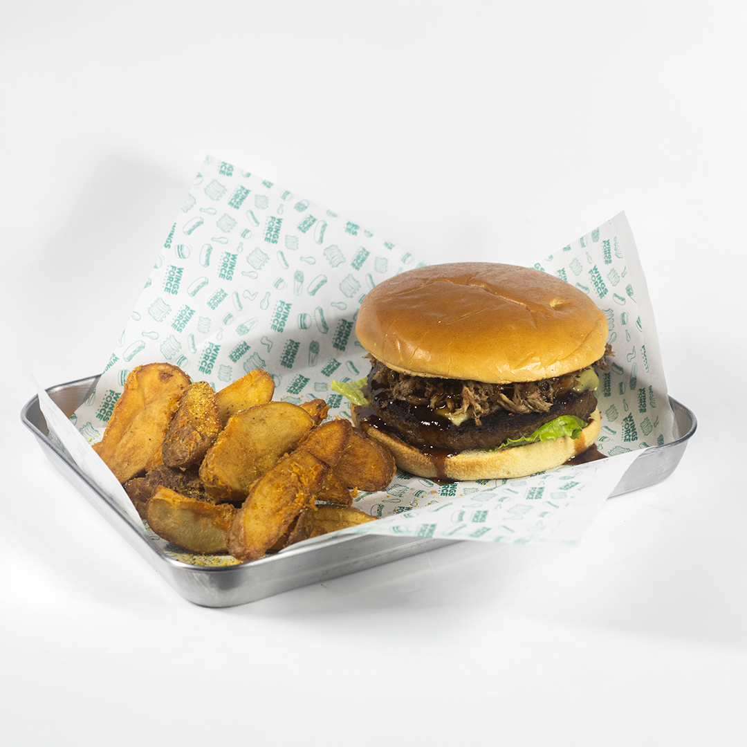 Carne de res, queso manchego, aros de cebolla aderezo ranch, piña, pan brioche y salsa Bbq Ahumada.
