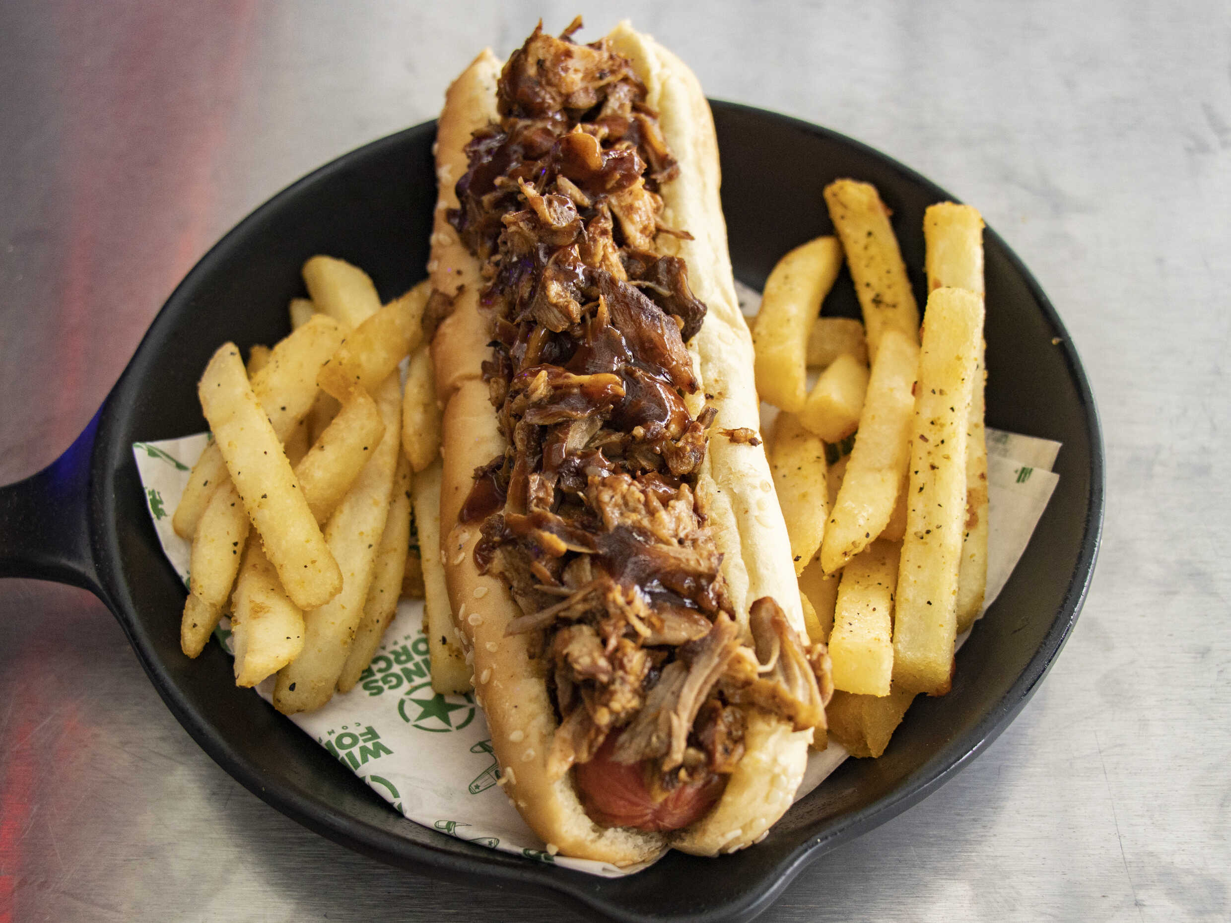 Pan, salchicha, tocino, cebolla caramelizada, costilla de cerdo, aderezo Ranch y un toque de salsa Ahumada