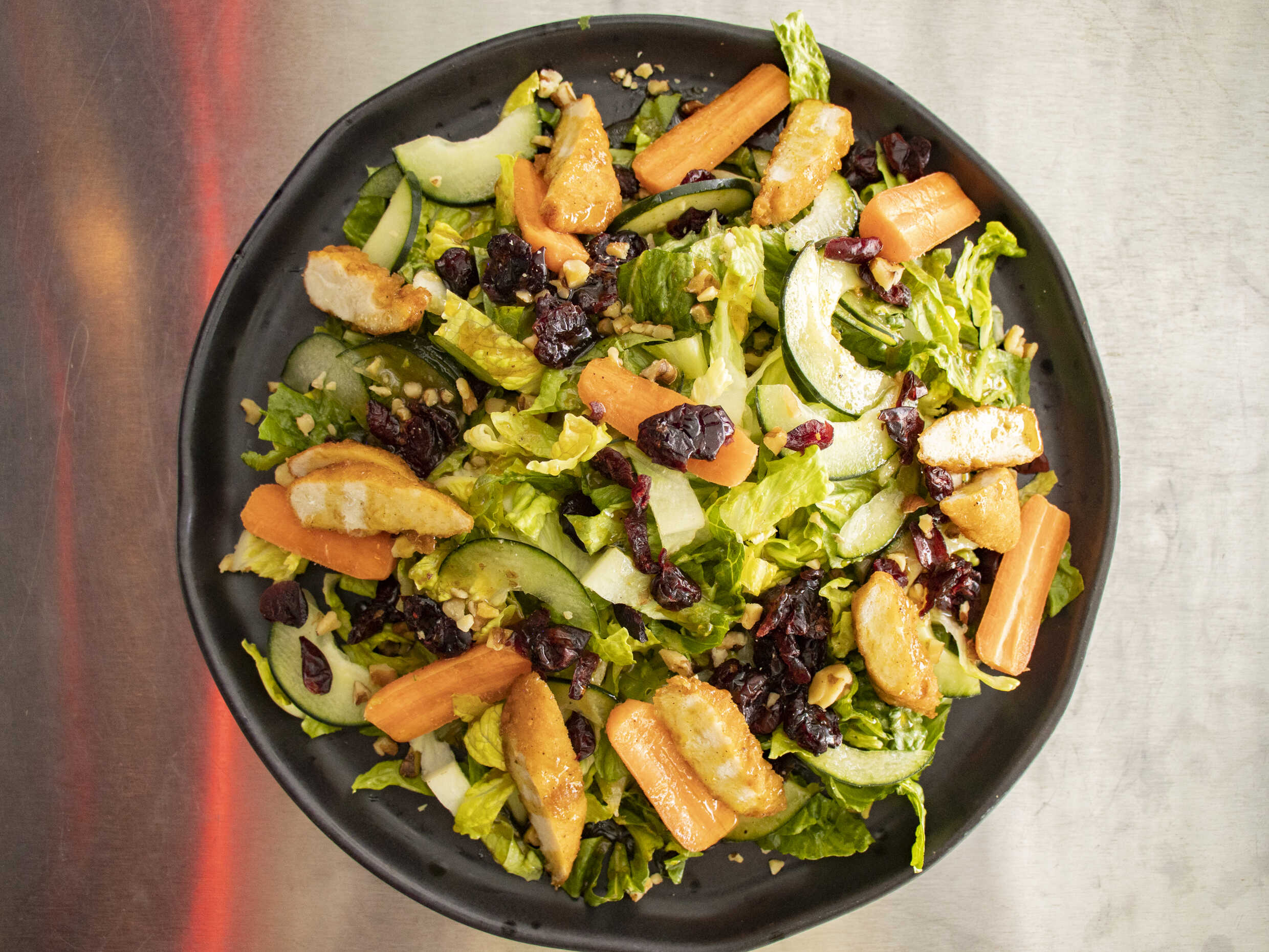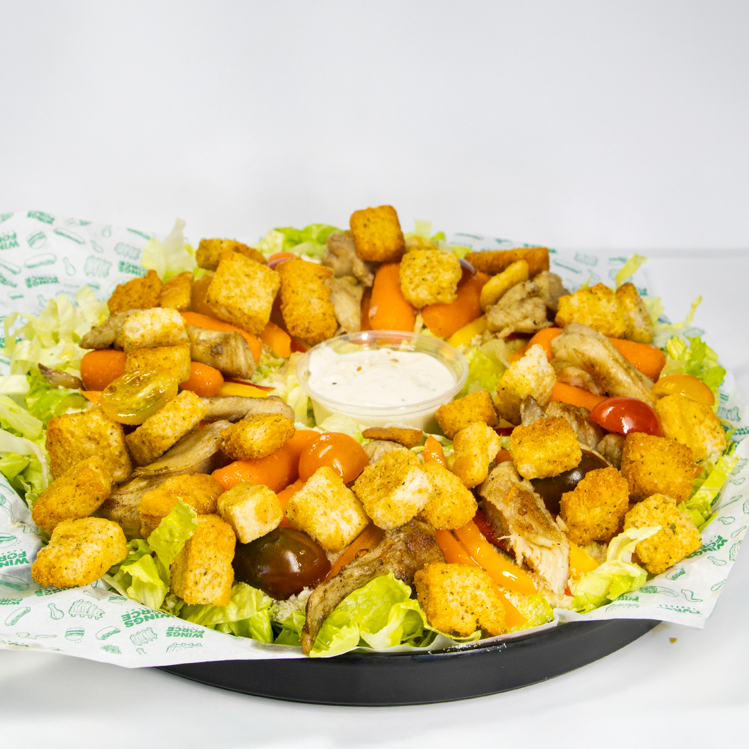 Base de ensalada, Parmesano, Pechuga a la Parrilla, Aderezo a elegir.