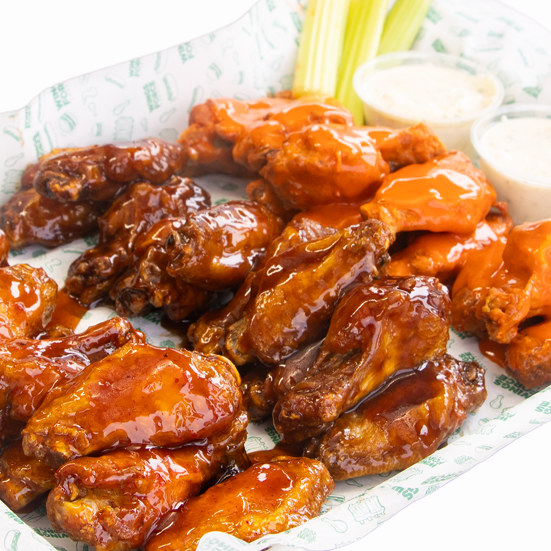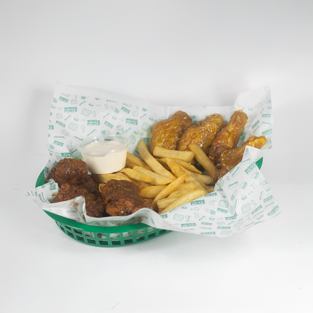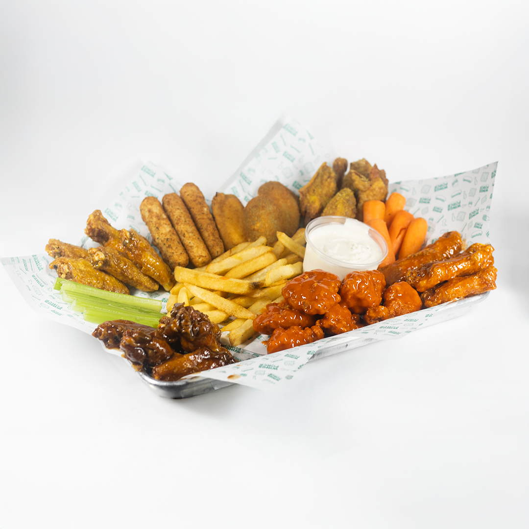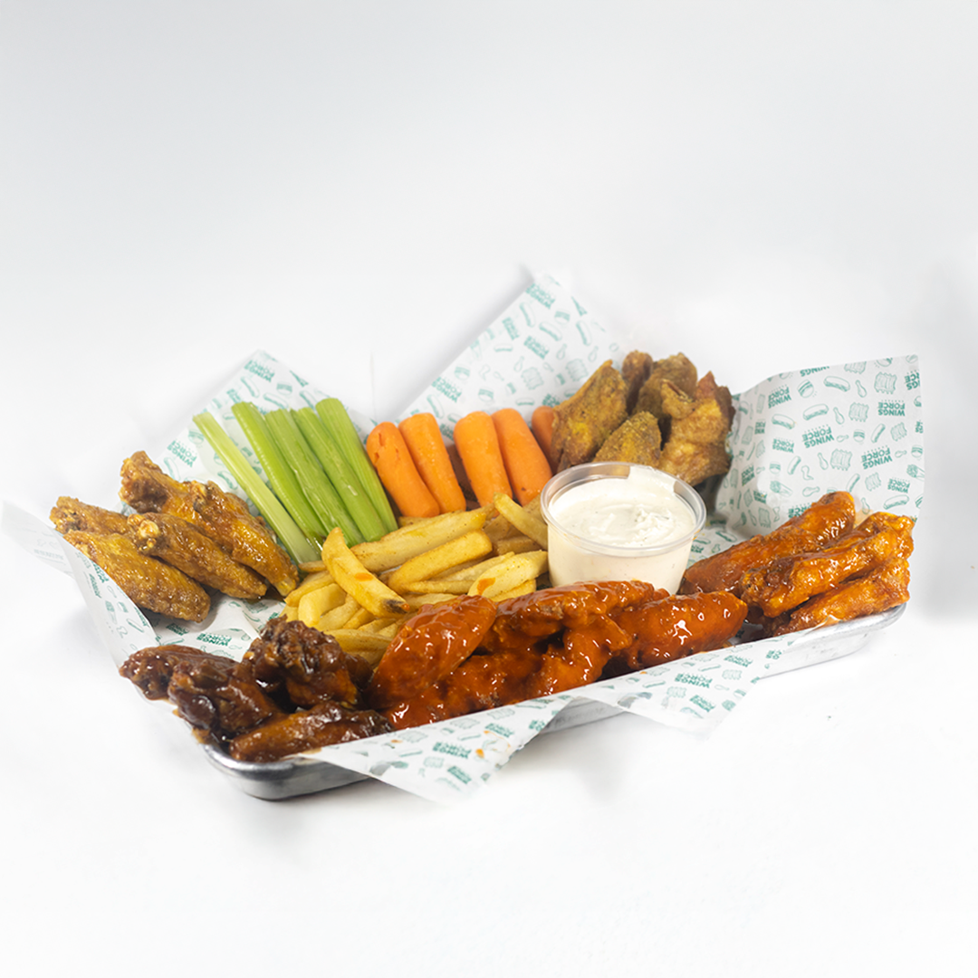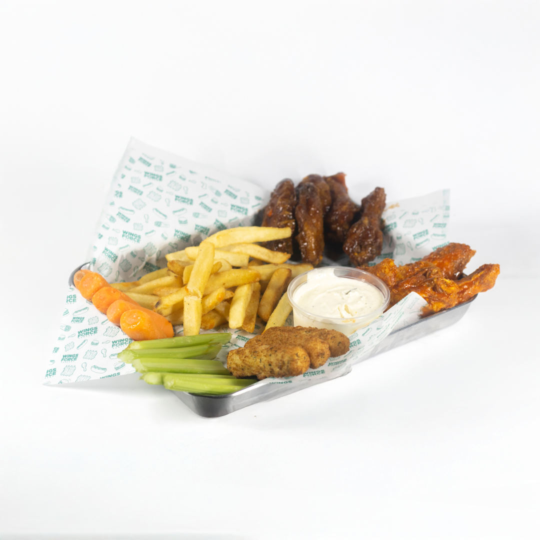 5 alitas diferentes + 5 alitas dulces + 5 alitas picantes+ 5 alitas BBQ+ 220g papas a la francesa + 250g tenders + vegetales + 1 aderezo 120ml