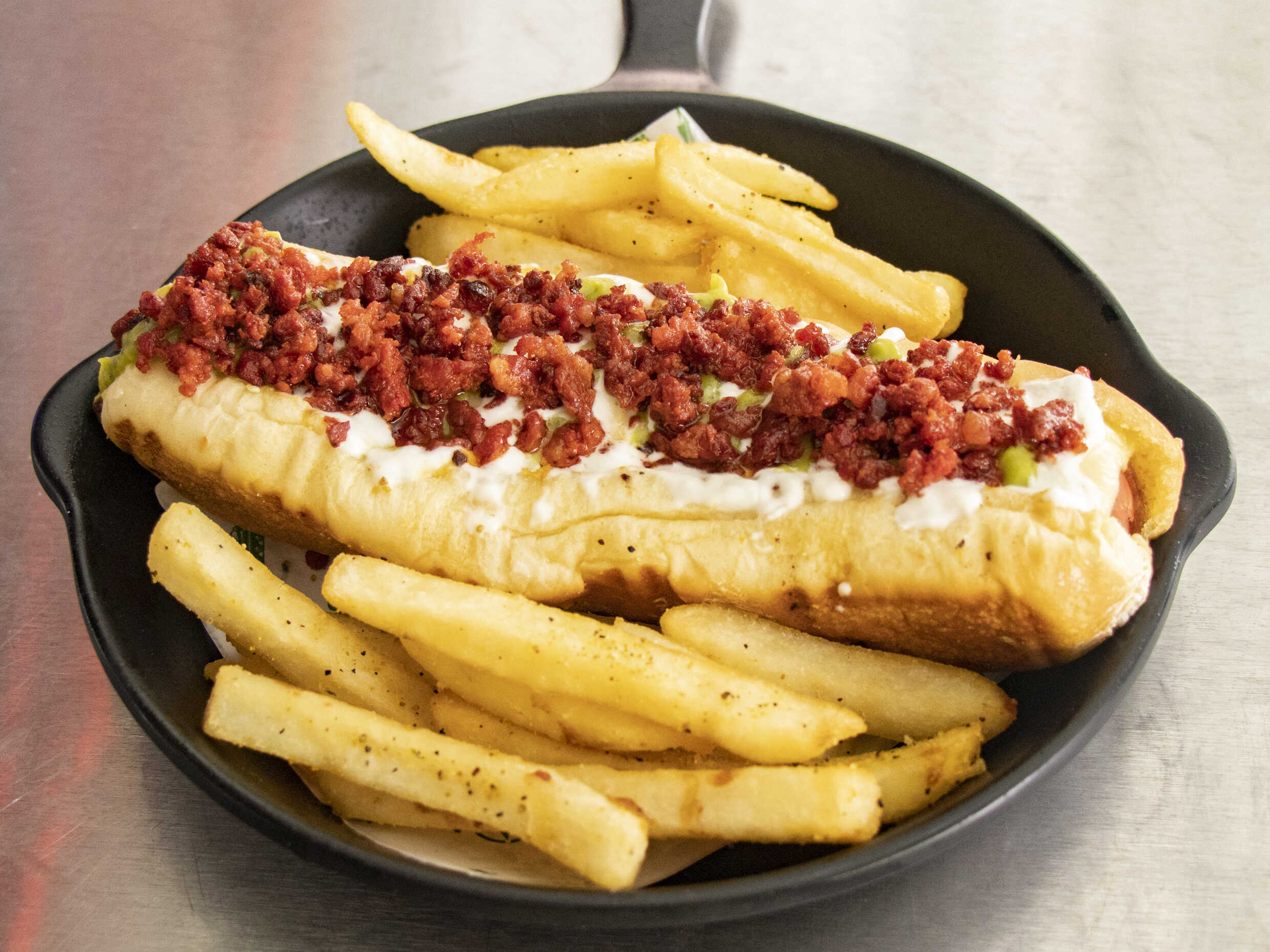 Pan, salchicha, tocino, queso cheddar, cebolla caramelizada, aderezo Ranch, pico de gallo y un toque de chorizo.