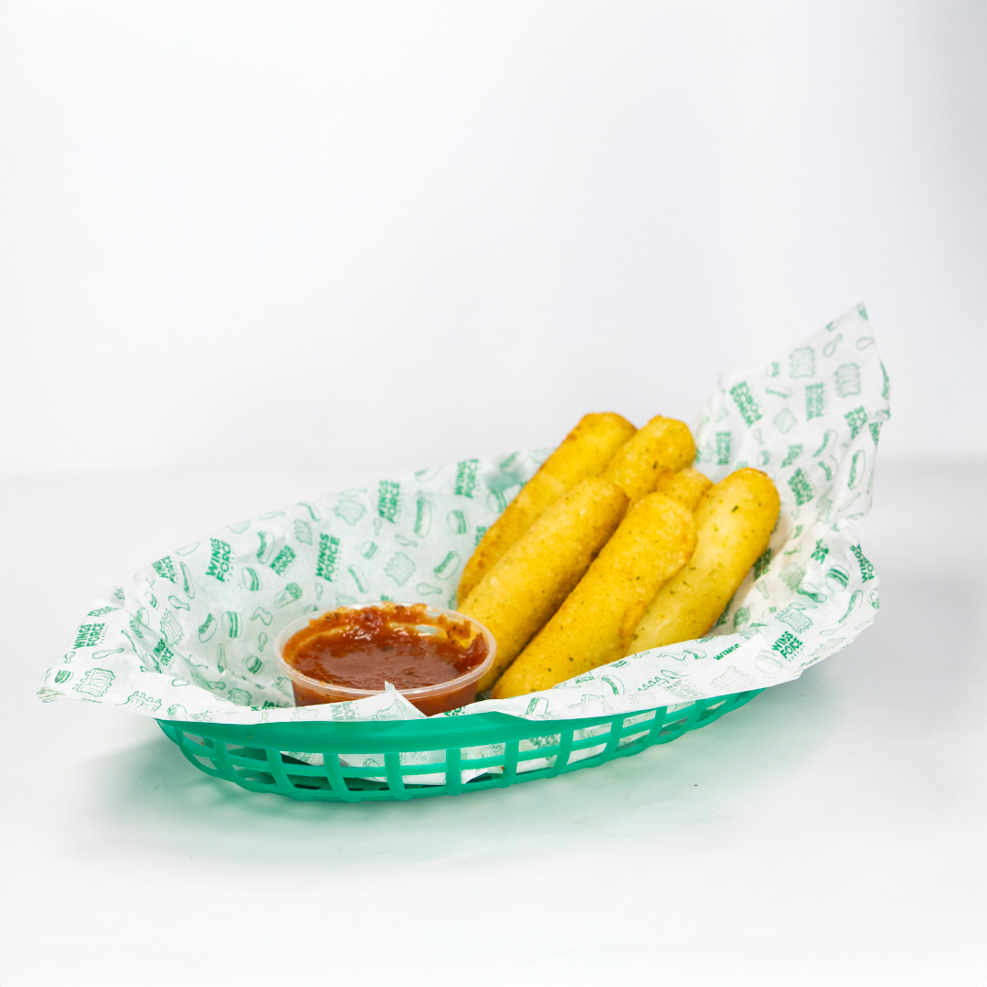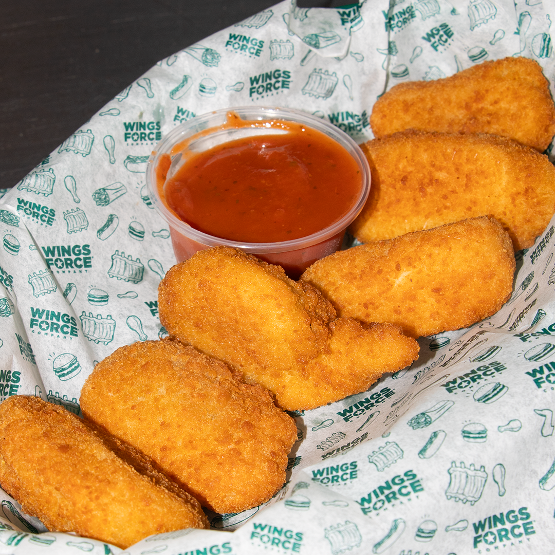 6 pzas de dedos de queso mozarella empani zados, acompañados de salsa italiana