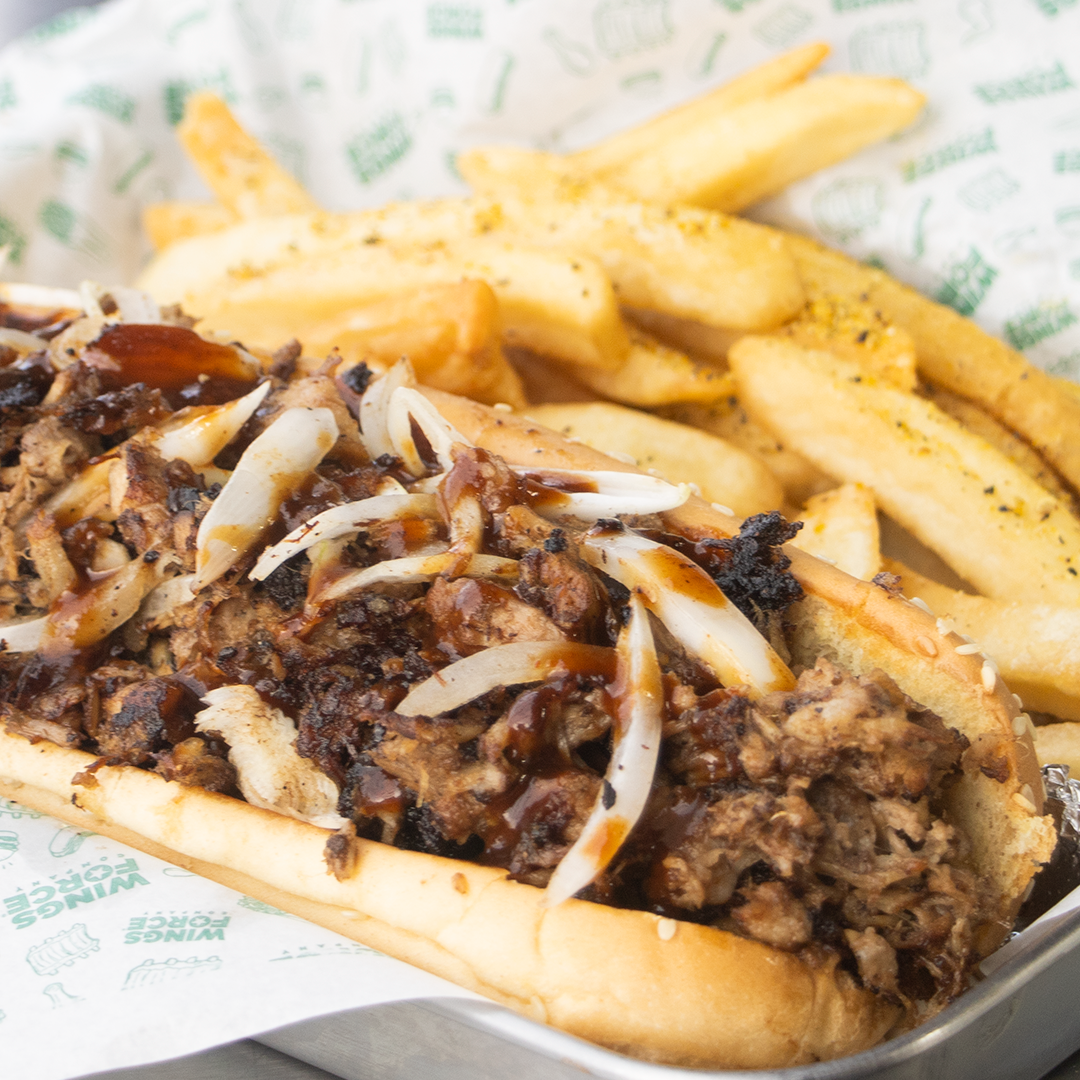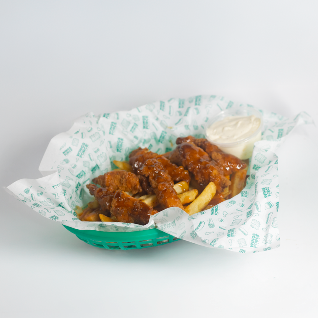 Tender de pollo servidas sobre papas a la francesa, bañadas con salsas buffalo y bbq ahumada más aderezo ranch o blue cheese.
