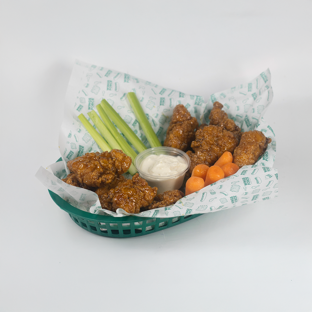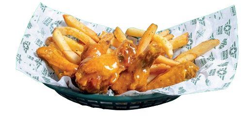 5 alitas dulces + 5 alitas picantes+ 3pz dedos de queso + 220g papas a la francesa + vegetales + 1 aderezo grande 120ml