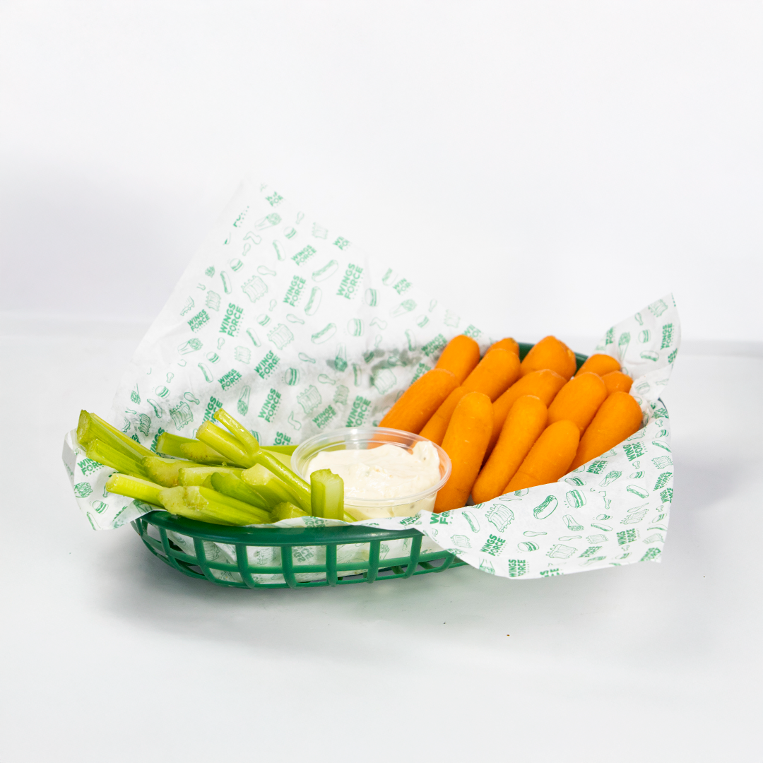 Frescos palitos de apio con zanahorias baby, acompañados de aderezo ranch
