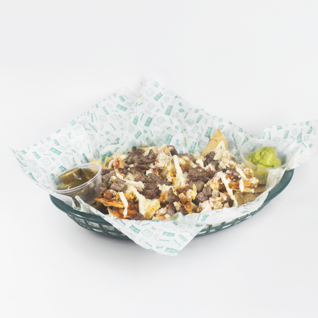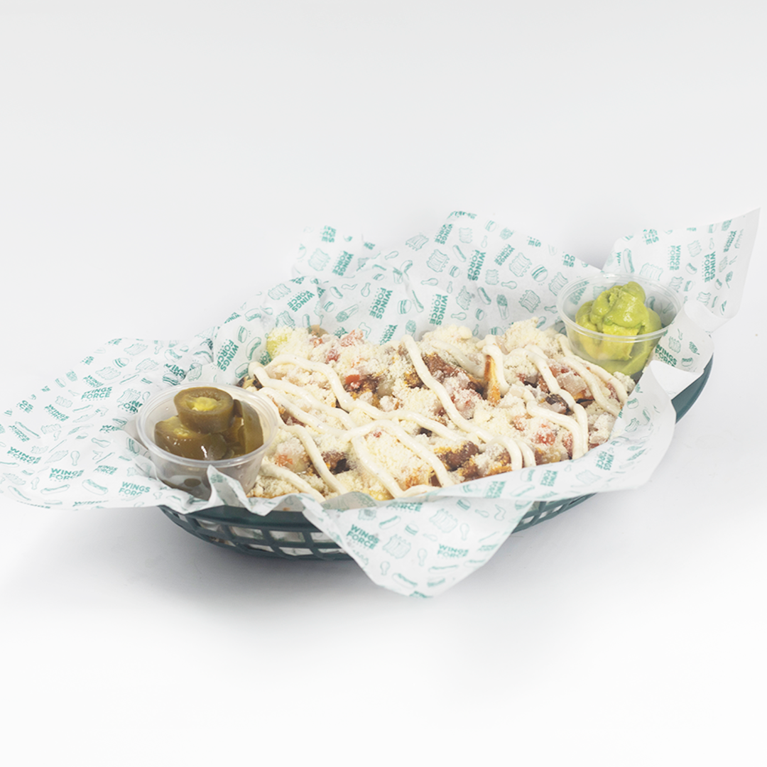 Totopos de maiz bañados con nuestro chilli especial force, queso cheddar liquido, pico de gallo, chile jalapeños y guacamole.