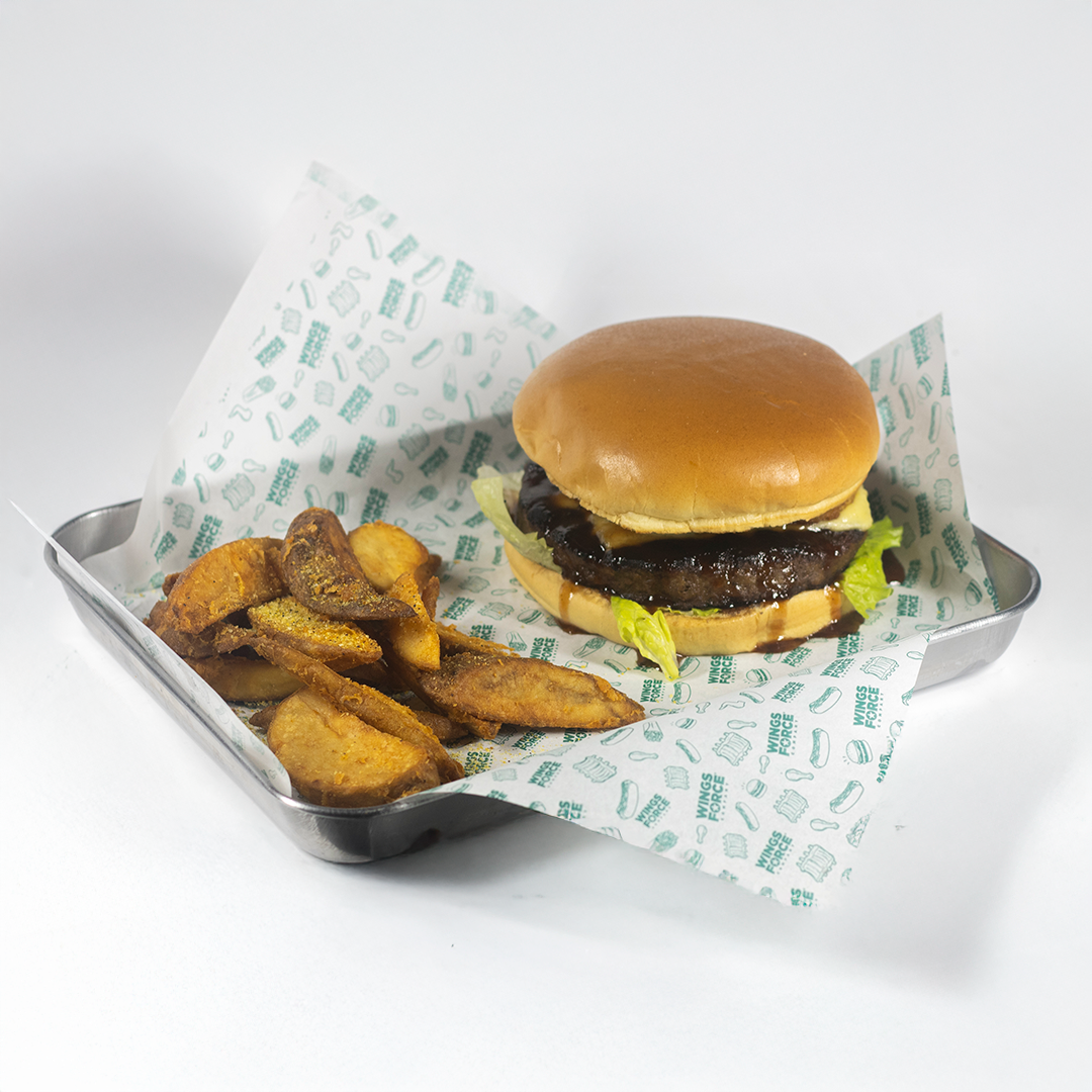 Baby back ribs, carne de res, queso manchego, aderezo ranch, pan brioche, cebolla caramelizada.