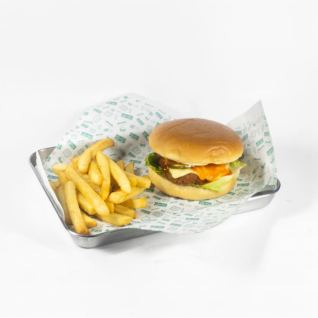 Tender de pollo, queso manchego, pepinillos, lechuga, salsa buffalo, pan brioche y aderezo ranch.