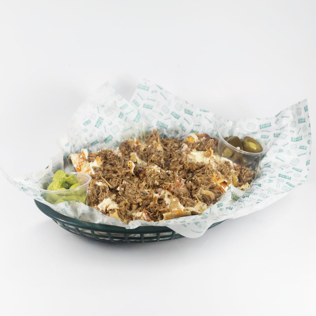 Totopos bañados con nuestro chilli especial force, queso cheddar liquido, pico de gallo, chile jalapeños, guacamole y 150g de carne de costilla