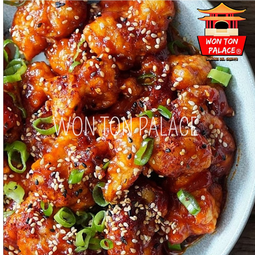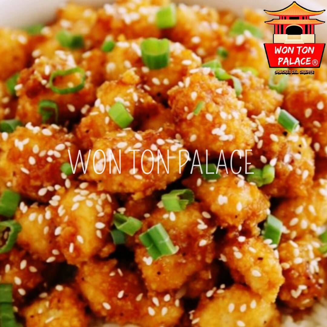 Cubos de pollo rebosados, salteados con ajonjolí y chile seco, cubiertos en nuestra salsa dulce salada y ligeramente picante.