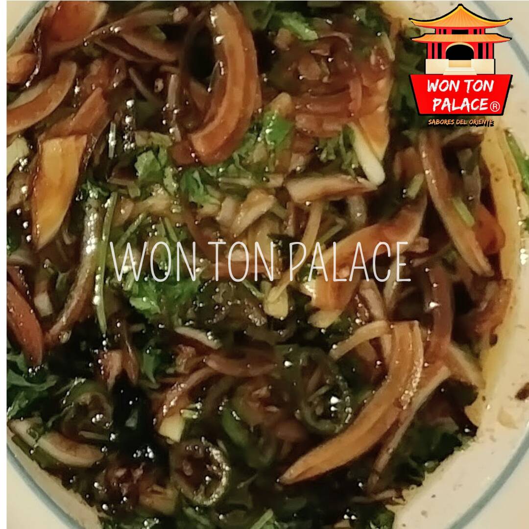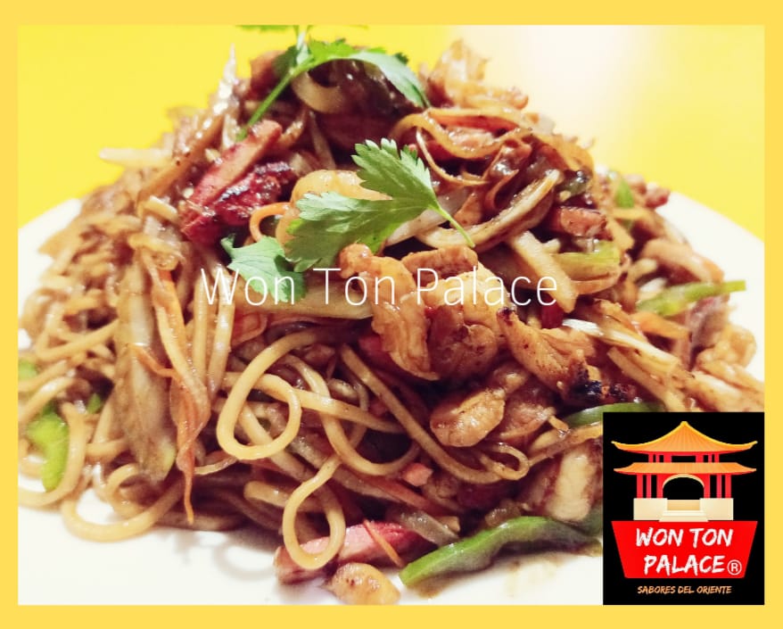 Fideos frescos de la casa sazonados y salteados con vegetales, pollo, cha siu y camarones. Incluye salsa piao.