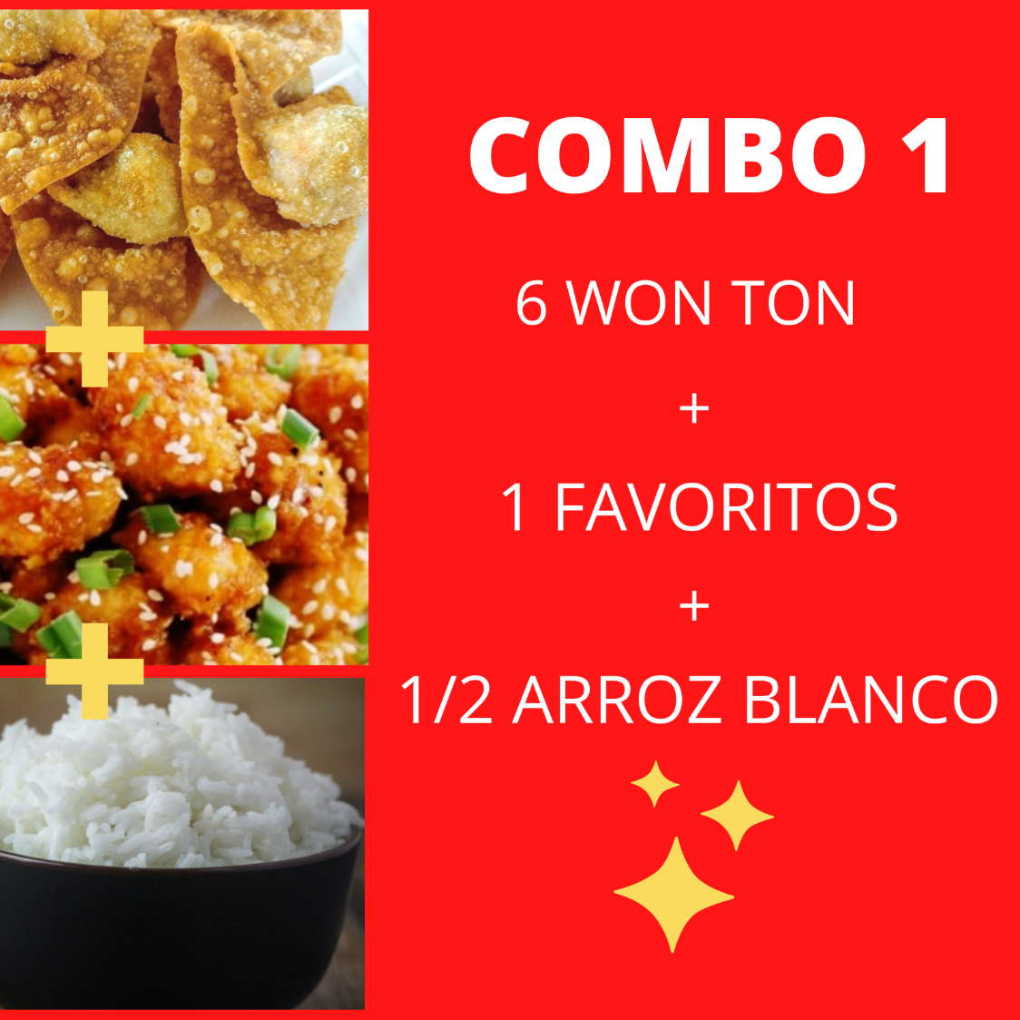 Won Ton Fritos de Carne 6 pzas*1 + Elige tu favorito*1 + Arroz Blanco 1/2 L*1