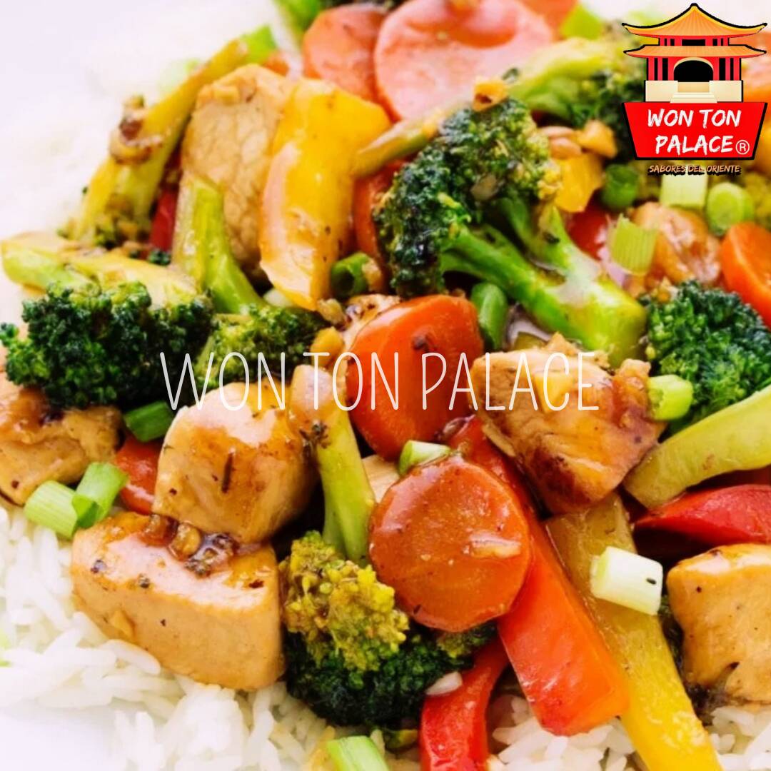 A elegir entre, pollo, res, puerco ó pescado salteado con vegetales en salsa suprema. Incluye salsa piao.
