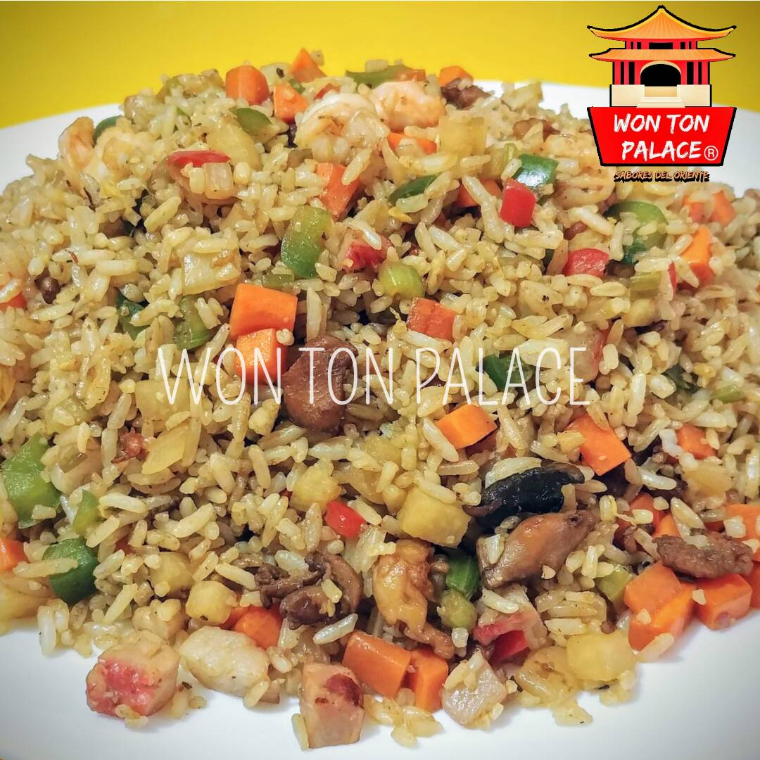 Arroz frito con vegetales, pollo, cha siu y camarones. Incuye salsa piao.