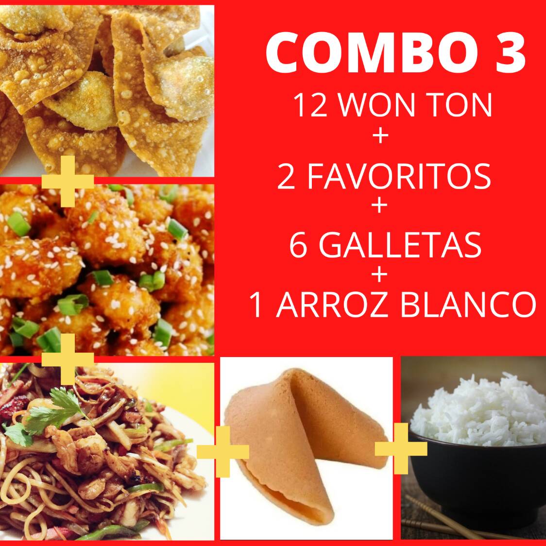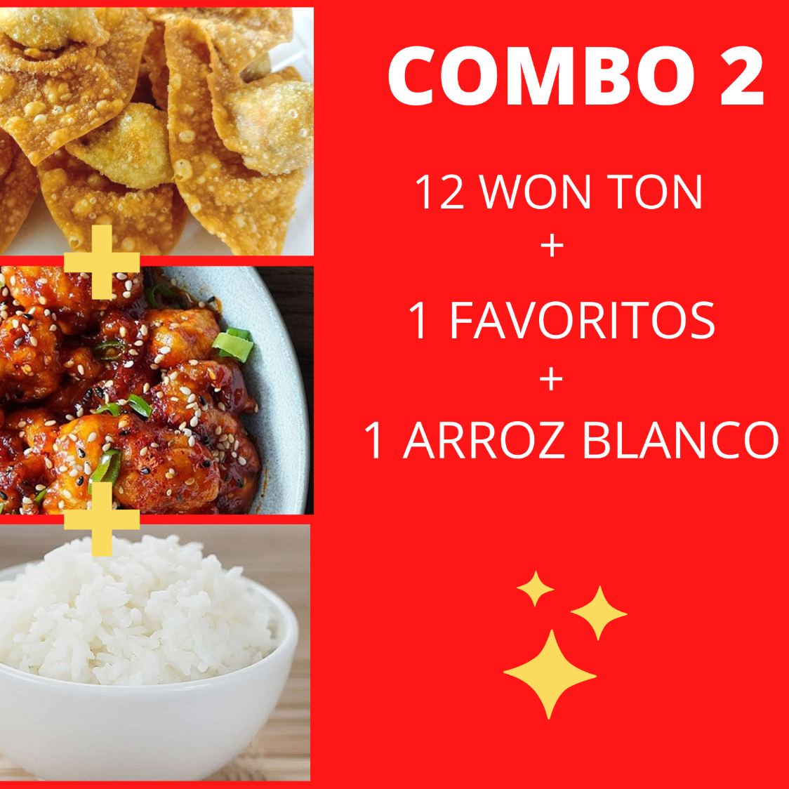 Won Ton Fritos de Carne 12 pzas*1 + Elige tu favorito*1 + Arroz Blanco 1/2 L*1