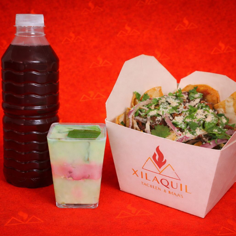 Incluye Xilaquil de pollo, agua de 500 ml a elegir y gelatina de mosaico.