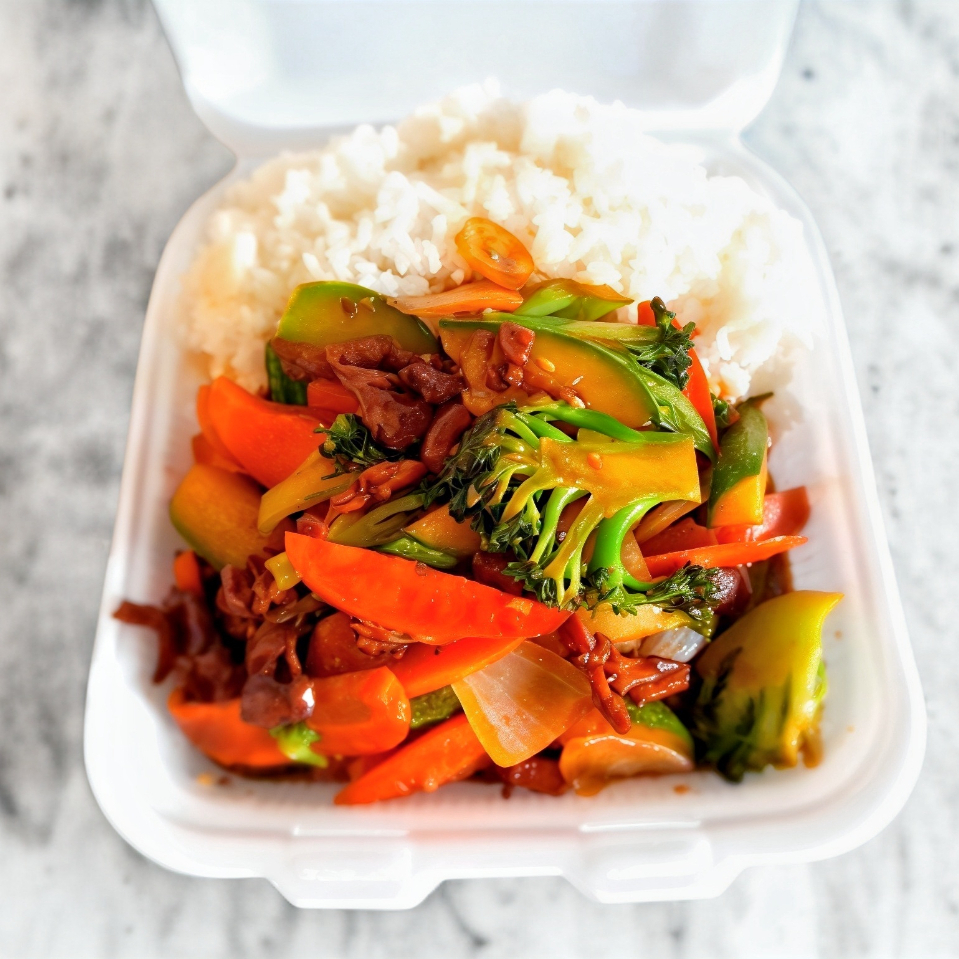 verduras salteados con pollo estilo teriyaki, acompañada de arroz blanco