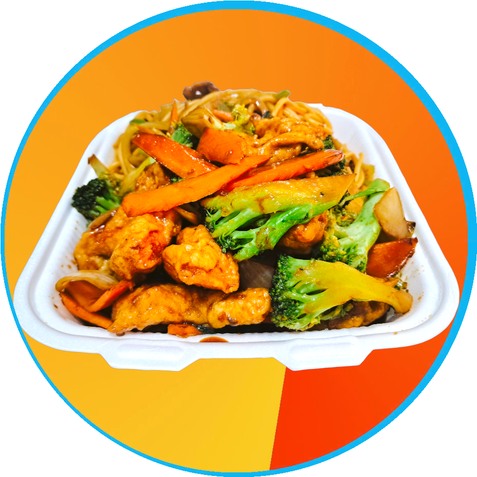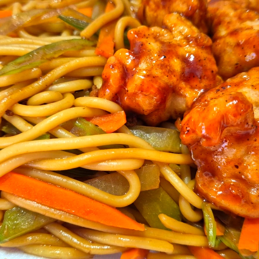 tempura de pollo estilo teriyaki con vegetales, bañado con salsa muy picante acompañado de pasta chao mein con vegetales