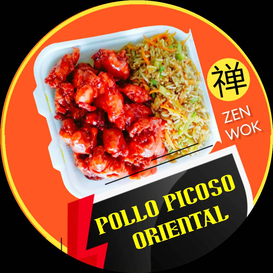 tempura de pollo estilo teriyaki con vegetales, bañado con salsa muy picante, acompañado con arroz frito con vegetales