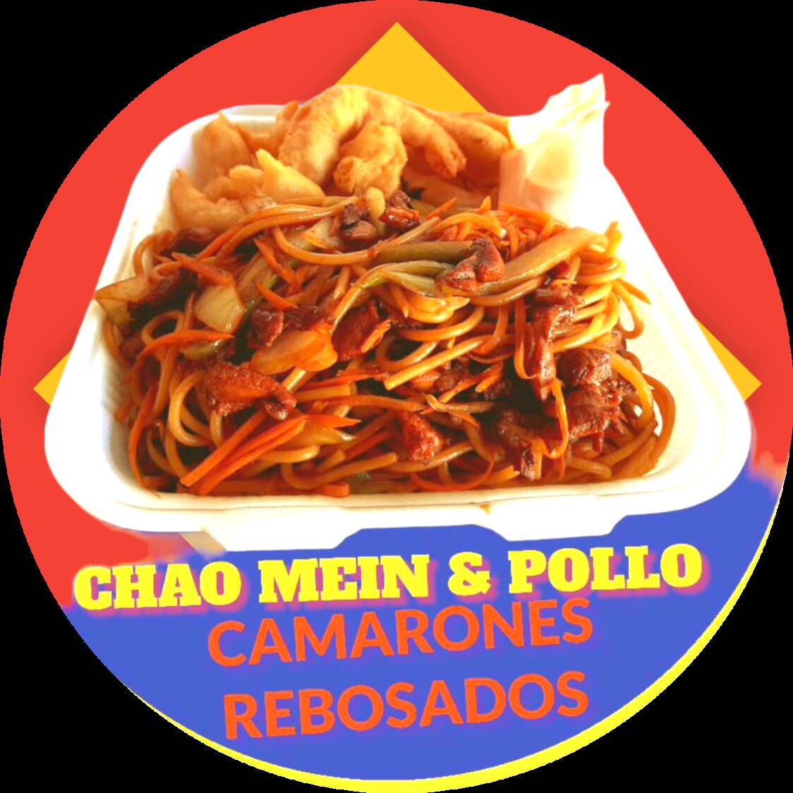 Chao mein con pollo y camarones rebosados.